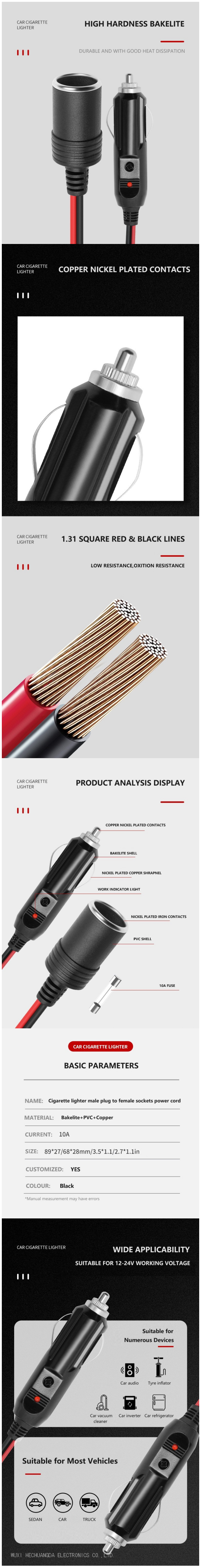 Customized Processing of Cigarette Lighter Male Plug to Female Sockets Power Cord