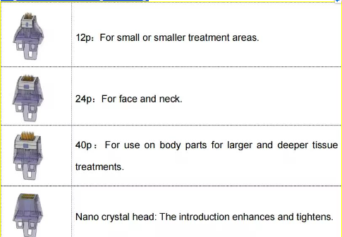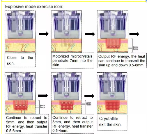The device is equipped with interchangeable 4 different probe configurations (12p, 24p, 40p,nano-probe), and the system can be freely adjusted to set the insulating Crystallite head to penetrate into the skin at different depths of the target tissue (between 0.5-7mm), providing Minimally invasive treatment for deep 8mm subcutaneous adipose tissue remodeling, thermal effect that penetrates subcutaneous tissue up to 7mm + additional 1mm depth, aimed at remodeling collagen and coagulating adipose tissue.