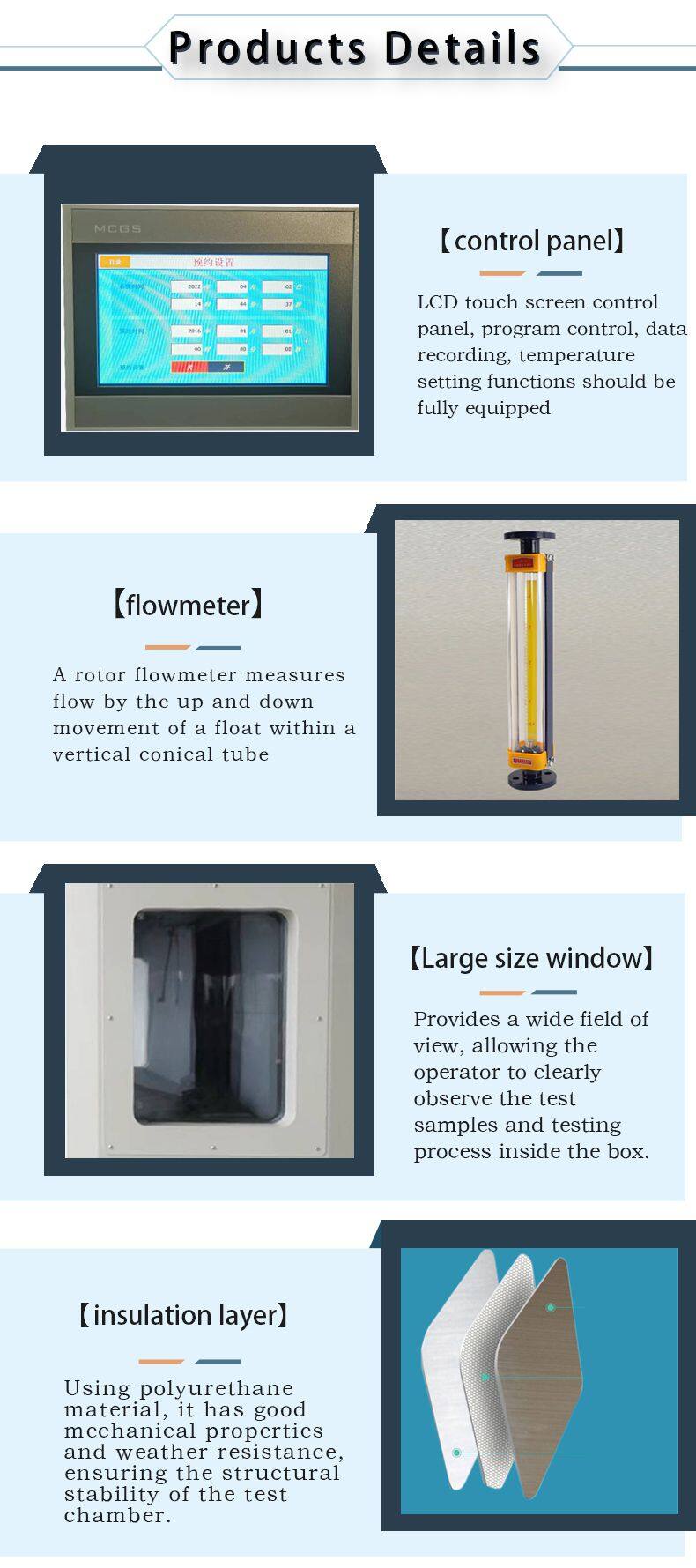 - Main products: Aging Test Chamber, Temperature and Humidity Test Chamber, High and Low Temperature Circulatory Test Chamber, Rapid Temperature Change Test Chamber, Saline Water Spray Tester, Packaging and transportation Tester, Vibration Tester, Tensile Tester, Furniture tester