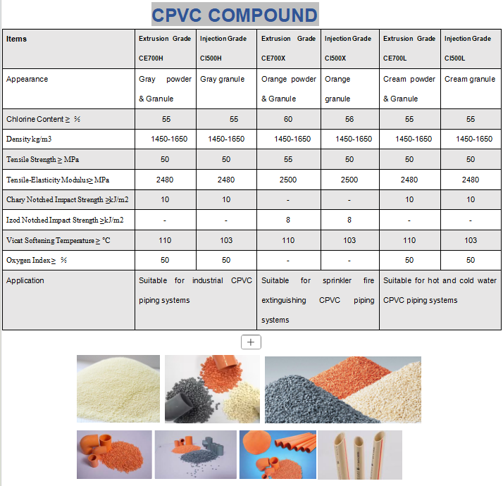 The CPVC compound is made by chlorination modification of PVC and is one advanced engineering material. After chlorination, the irregularity of molecular bond of the PVC and the polarity of molecular chain increase, the dissolvability and chemical stablility of the resin also increase, and accordingly improve the heat resistance and resist the corrosion of acid, caustic, salt and oxidant etc.