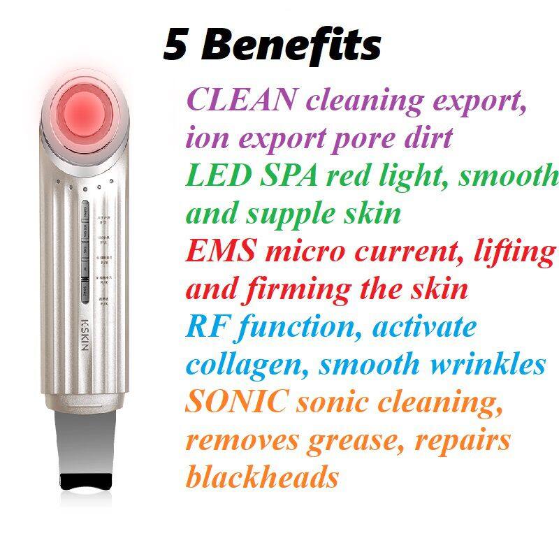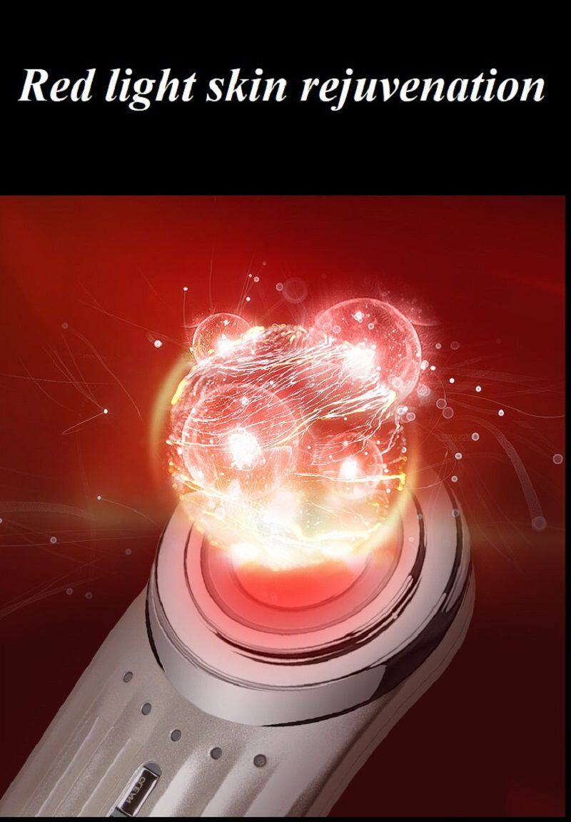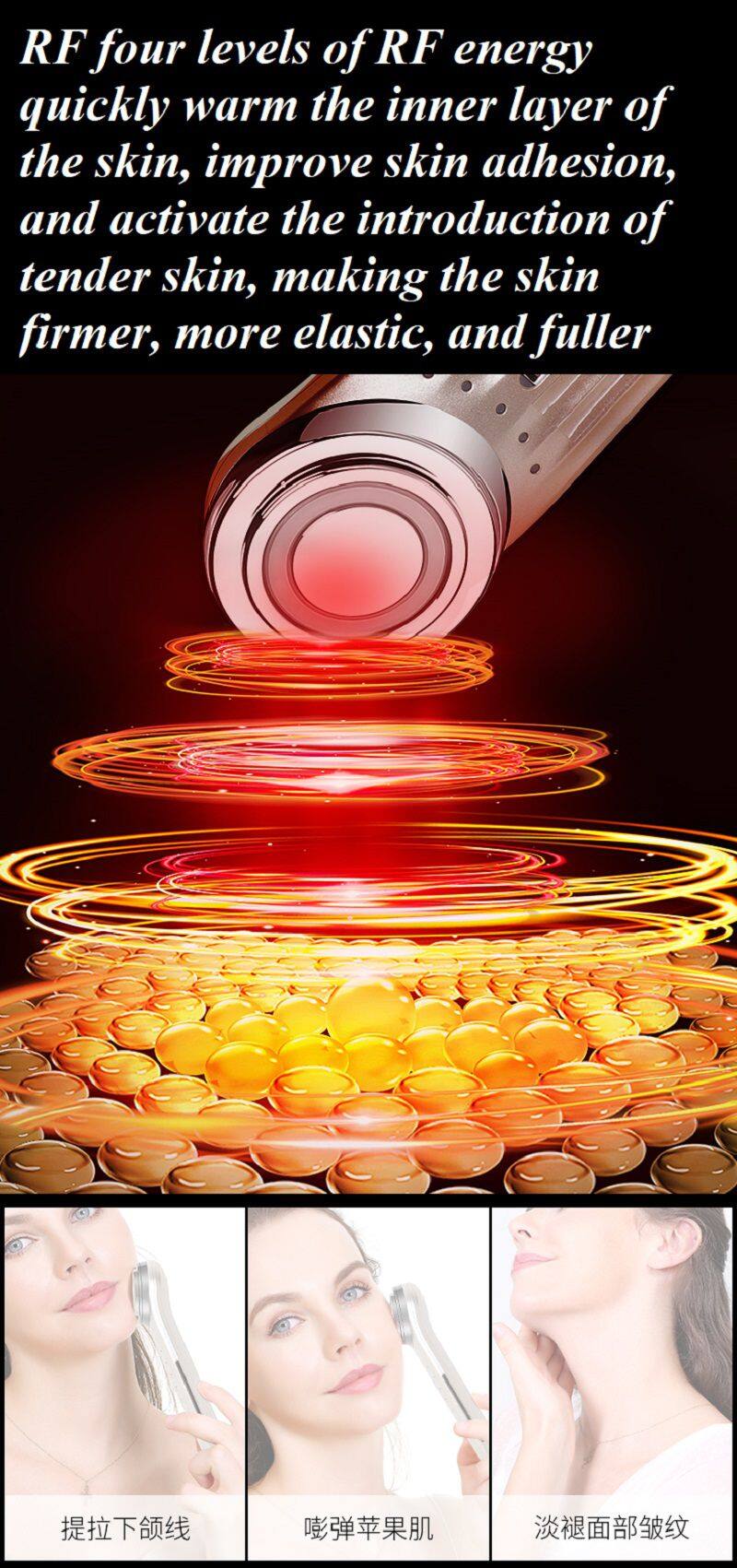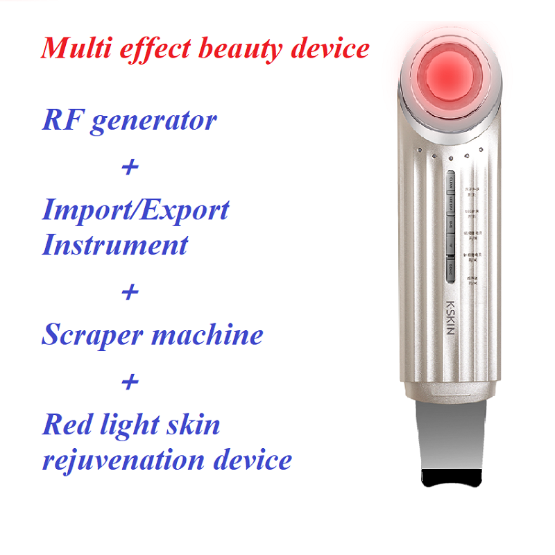 This product is a multi effect beauty device: RF generator+import/export device+skin scraper+red light rejuvenation device.