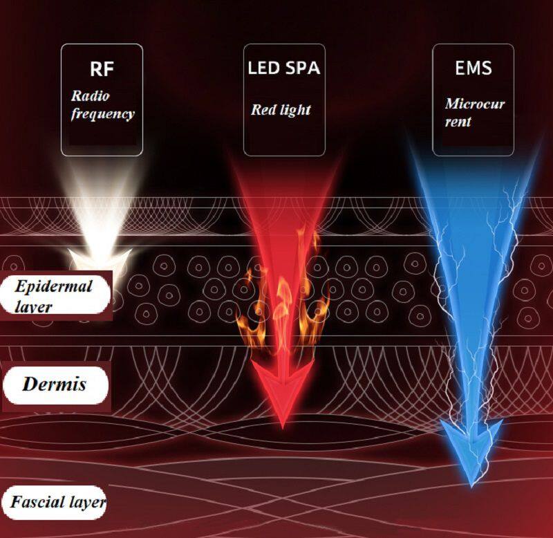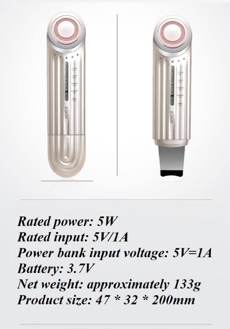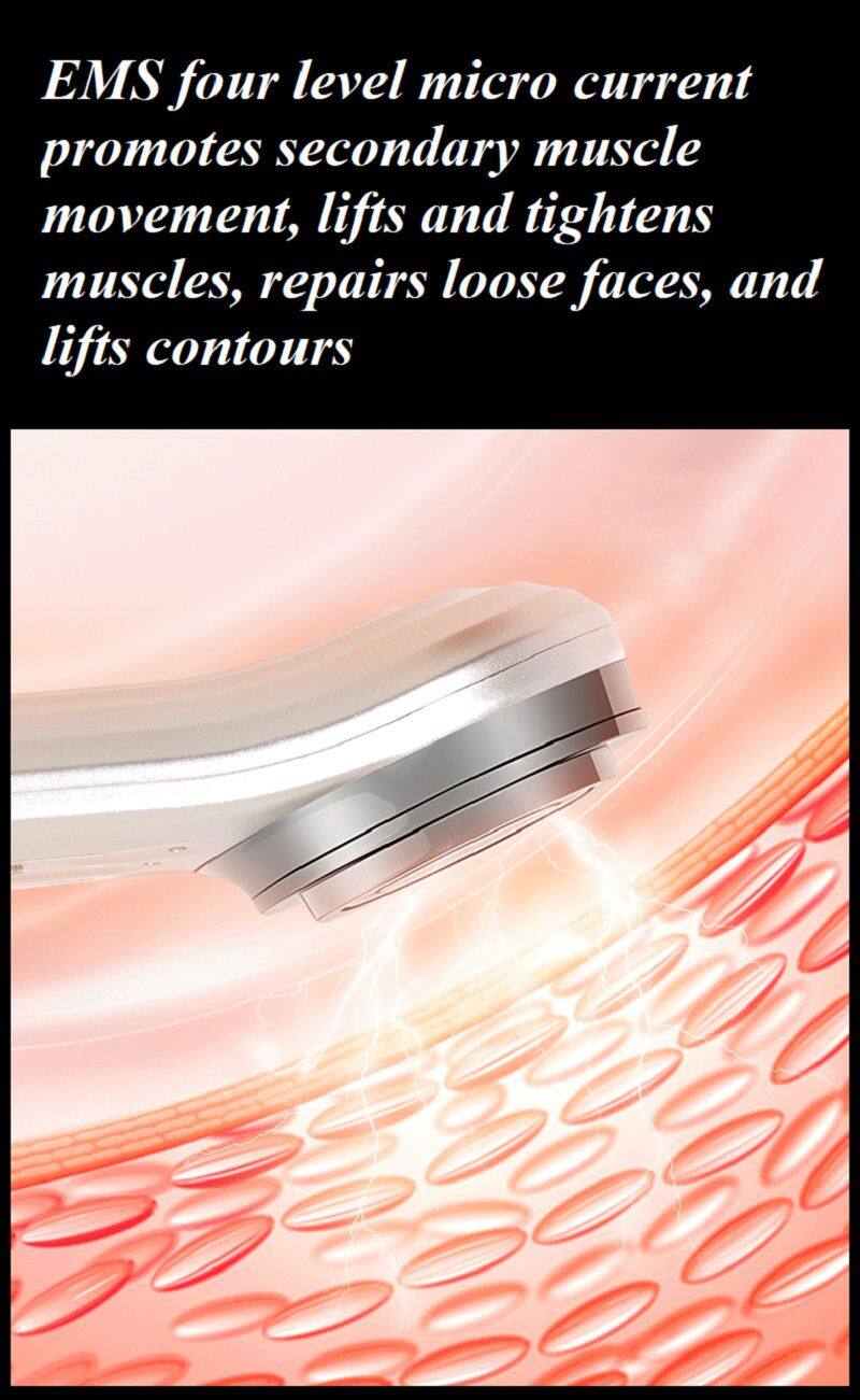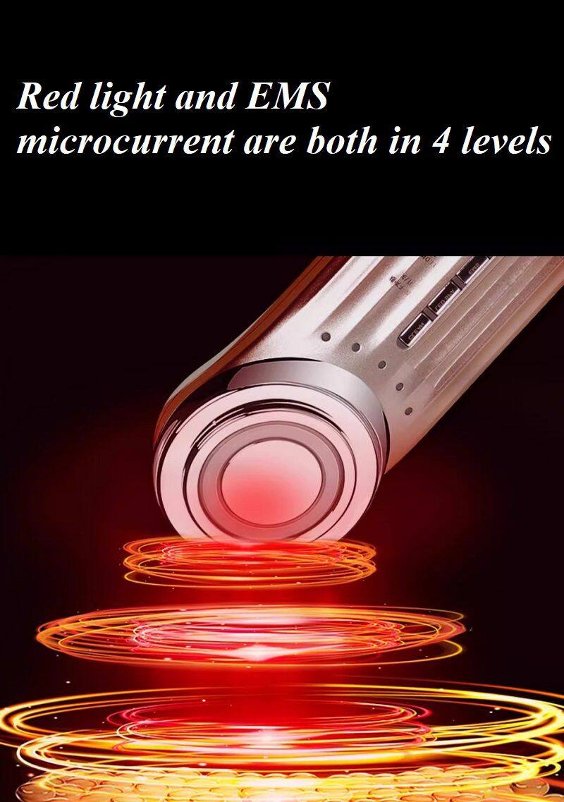 This product is a multi effect beauty device: RF generator+import/export device+skin scraper+red light rejuvenation device.