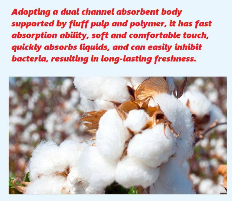 Adopting a dual channel absorbent body supported by fluff pulp and polymer, it has fast absorption ability, soft and comfortable touch, quickly absorbs liquids, and can easily inhibit bacteria, resulting in long-lasting freshness.