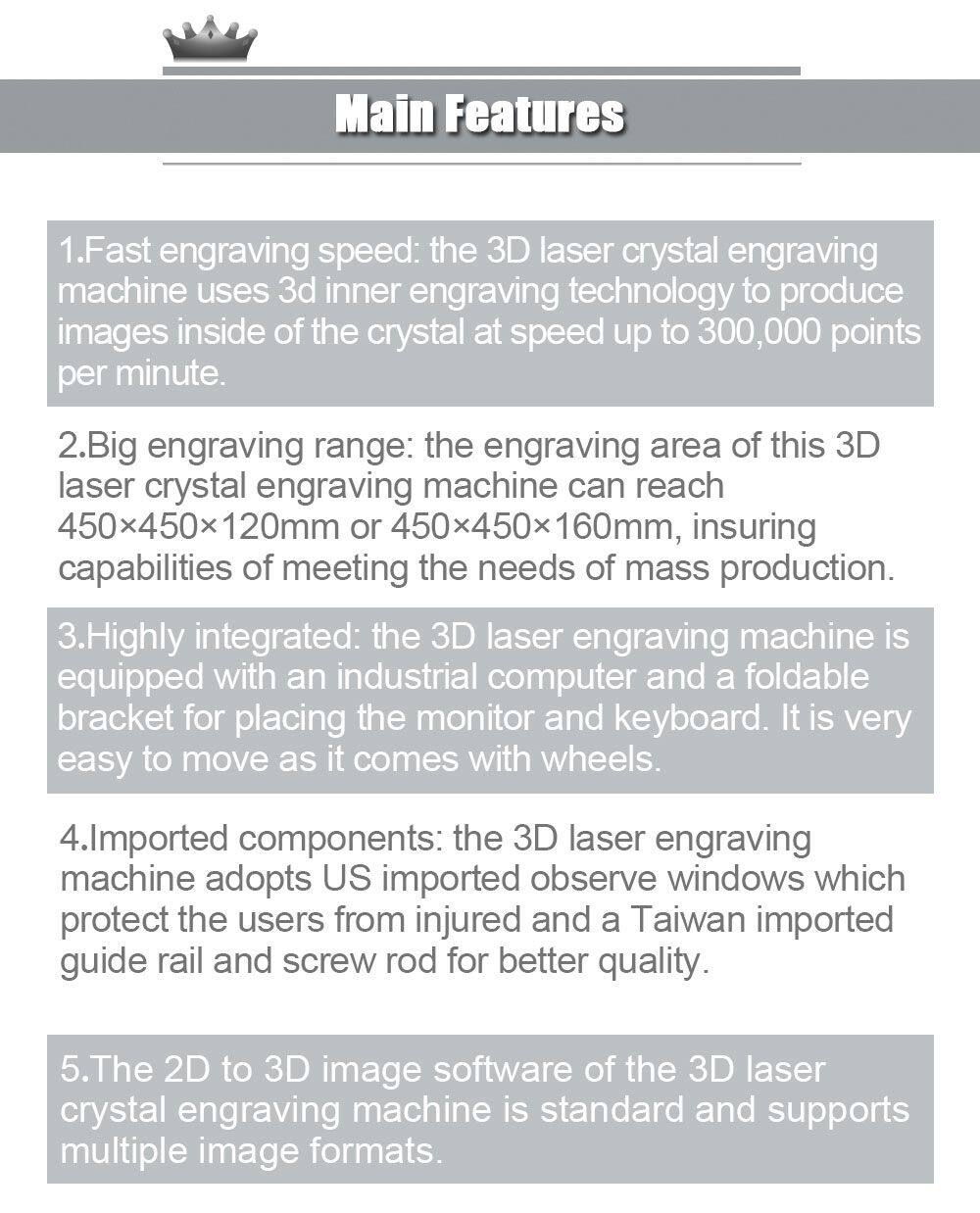 1. Fast engraving speed: the 3D laser photo crystal engraving machine uses 3d inner engraving technology to produce images inside of crystal, the engraving speed is up to 300,000 points/minute.