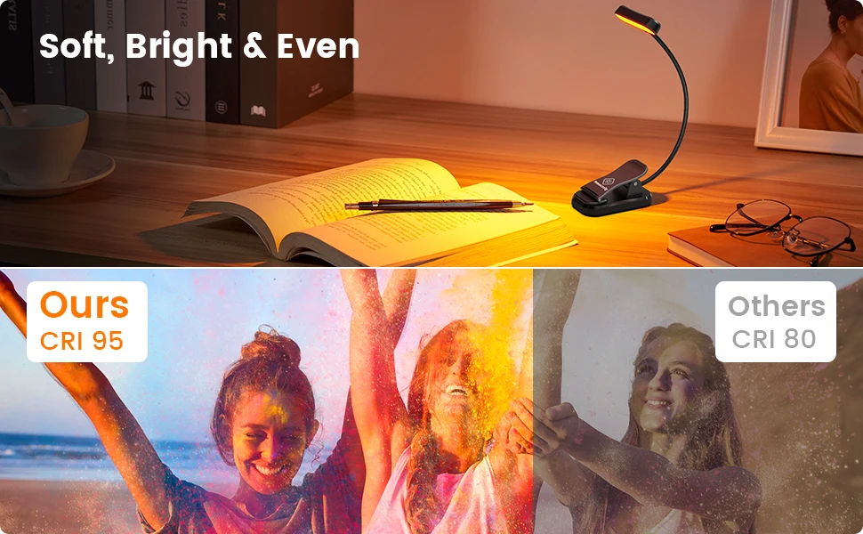* [Unique Horizontal ET-Head] Unlike other reading lights for books in bed, our book light has a special Horizontal ET-head design, which illuminates a wider page area with a more evenly spread light. It offers a wide field of consistent lighting with no hard edges. Meanwhile, the ET-head design creates just the right amount of light to amplify your joy of reading without disturbing others.