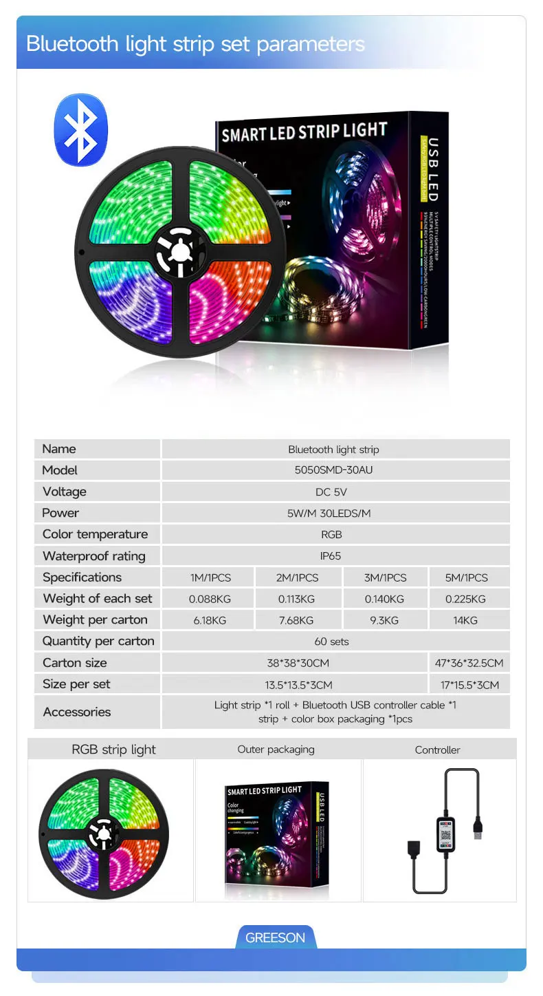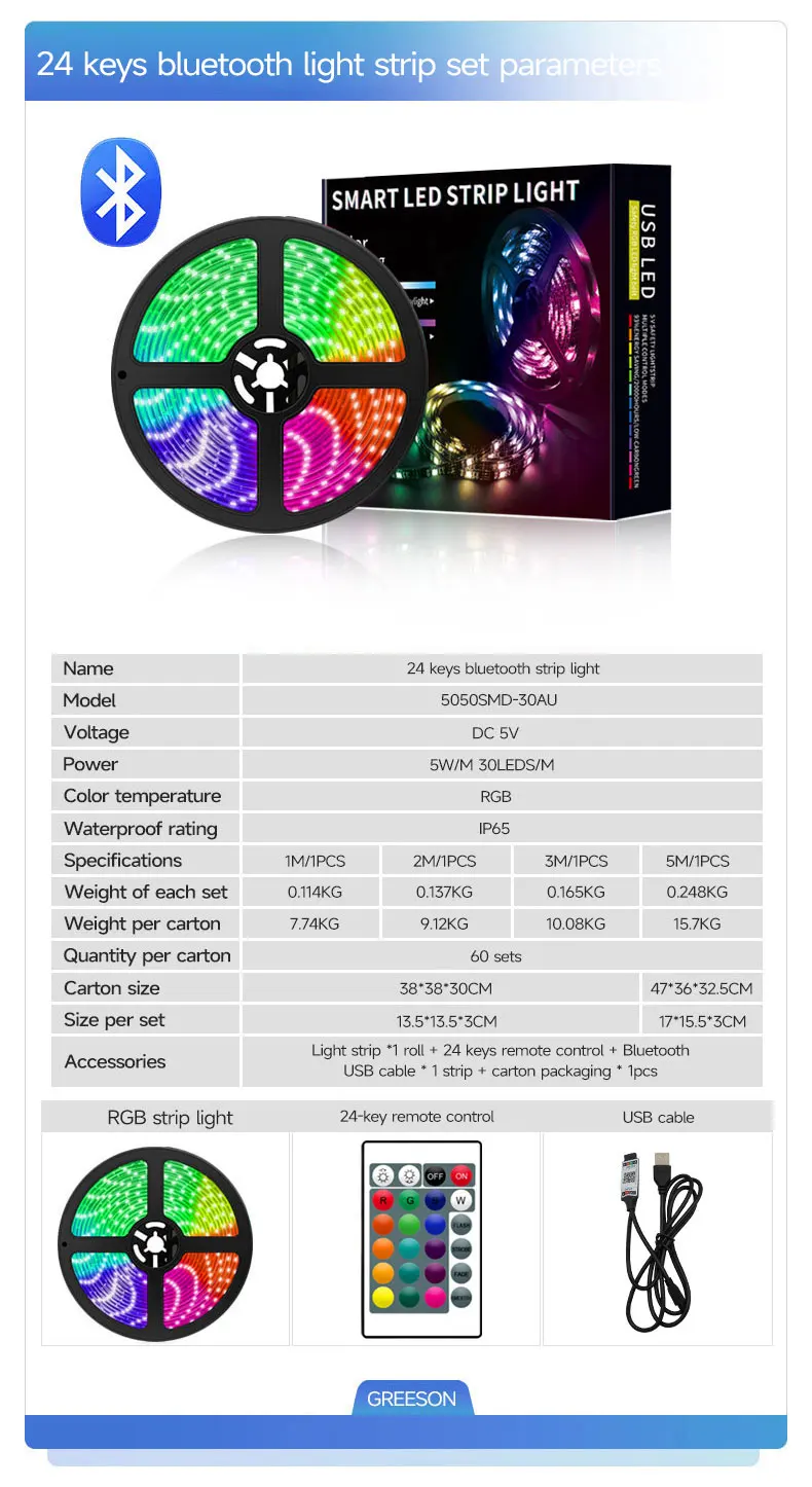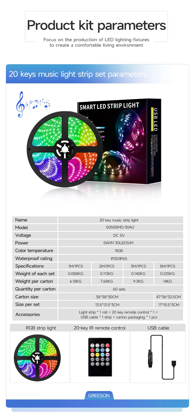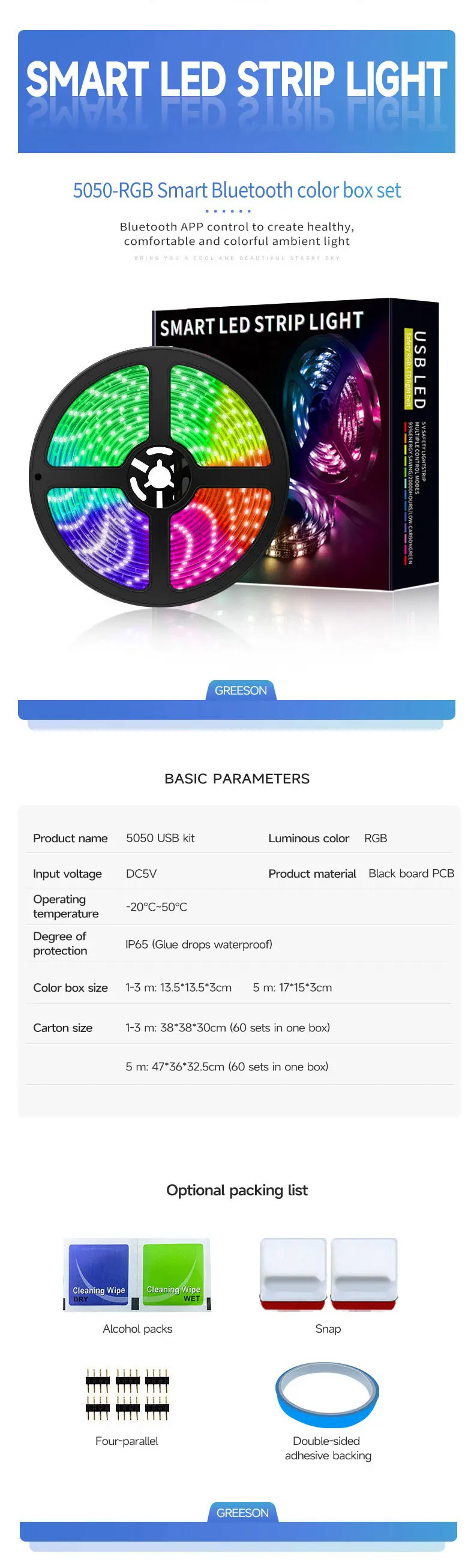 Home > Products > Other > RGB Strip Light Music Sync BT Control Flexible Ribbon LED 5050 Led Tape Light for Room Party Decoration TV Backlight