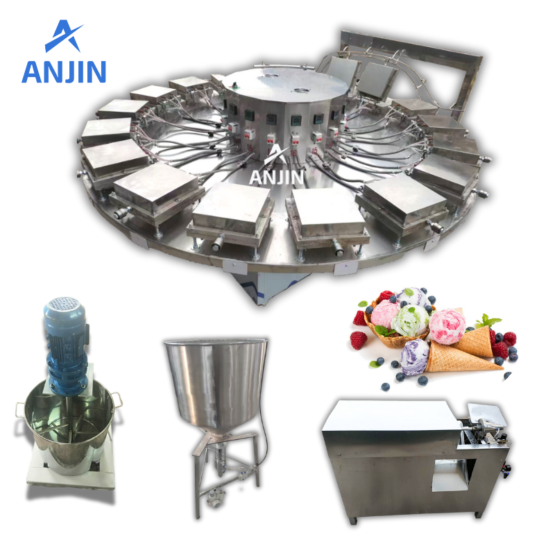 Consists of a batter paste mixer, batter paste injection device, baking plates, and cone rolling machine.
