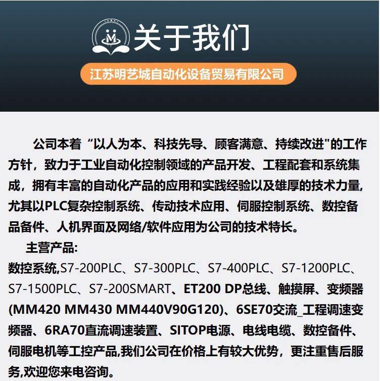 Main products:Numerical control system, S7-200PLC, S7-300PLC, S7-400PLC, S7-1200 PLC, S7-1500 PLC, S7-200SMART, ET200 DP bus, touch screen, frequency converter (MM420 MM430 MM440V90G120), 6SE70 AC engineering speed-regulating frequency converter, 6SE70.