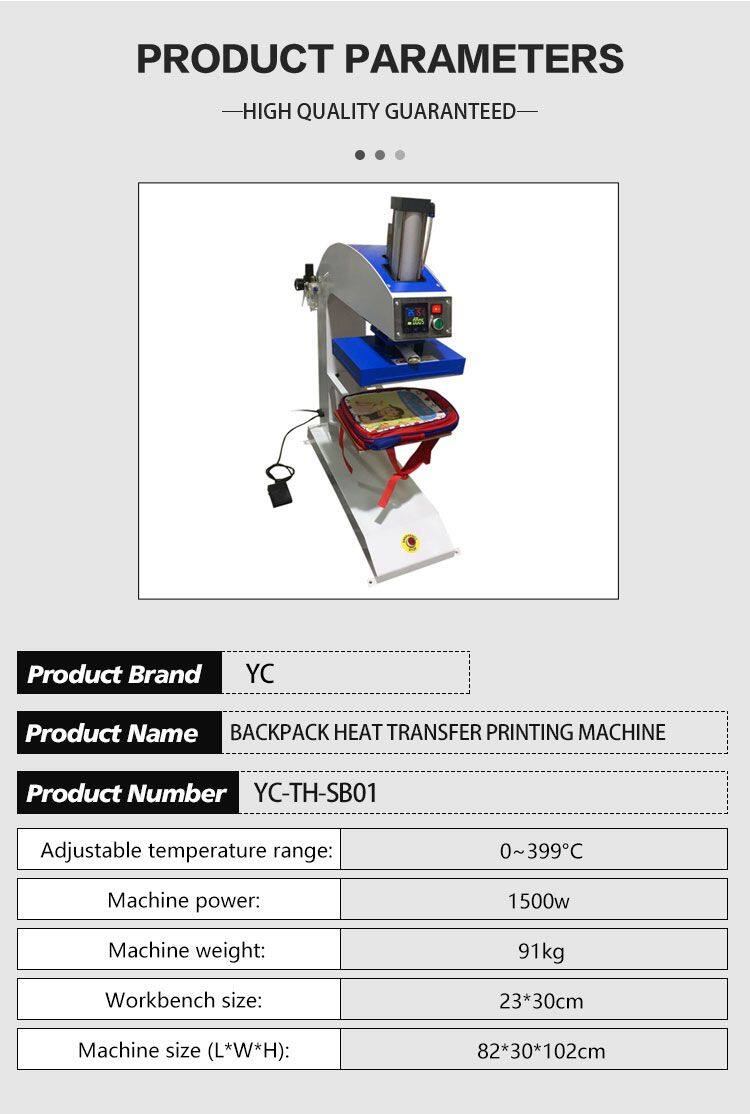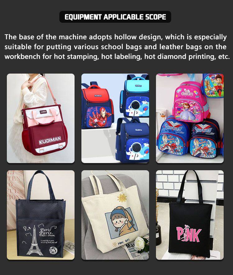 Small school bag stamping machine is designed for the needs of small items such as school bag customization, is the only choice for personalized school bag production. Its compact and portable body design does not take up too much space, whether it is a small studio, or a mobile kiosk hot stamping service point, can be easily installed and flexible use.