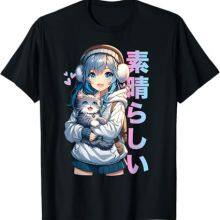 Cute Anime Girl With a Cat for Cat Lover Kawaii Otaku Manga T-Shirt