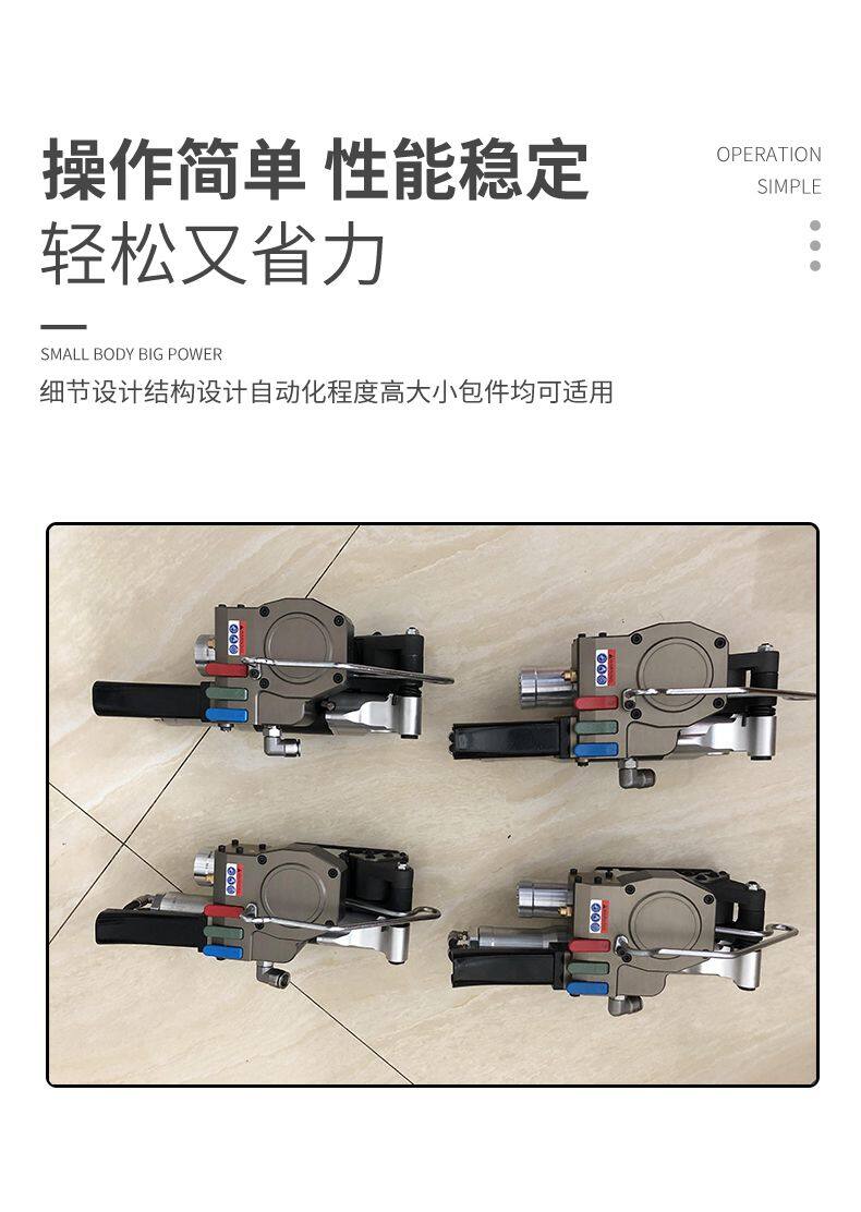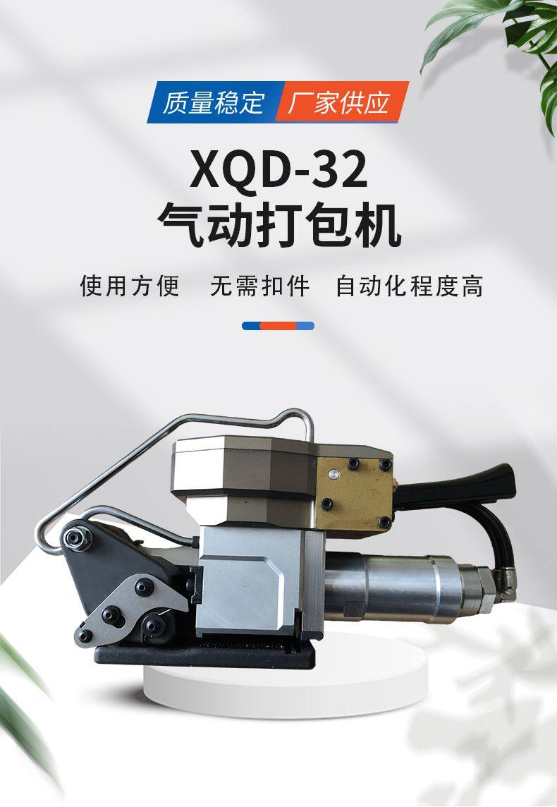 The XQD-32B pneumatic packaging tool is manufactured with imported Swiss technology, using high-pressure gas source frequency to tighten friction welding and complete packaging in one go. It has the characteristics of fast speed, smooth and firm welding joints, and beautiful appearance. Widely used in the light steel industry, non-ferrous metals, papermaking, stone, wood and other new packaging tools. This machine adopts the principle of pneumatic friction hot melt to bond the packing tape, with a width of 32mm that can be used for tying, resulting in better tying effect.