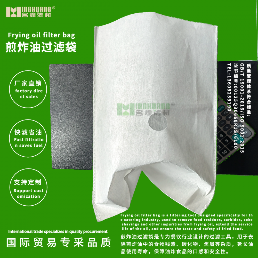Frying oil filter bag is a filtering tool designed specifically for the catering industry, used to remove food residues, carbides, coke shavings and other impurities from frying oil, extend the service life of the oil, and ensure the taste and safety of fried food. Its core function is to reduce oil oxidation and rancidity, decrease the generation of harmful substances, and help catering enterprises save oil costs.