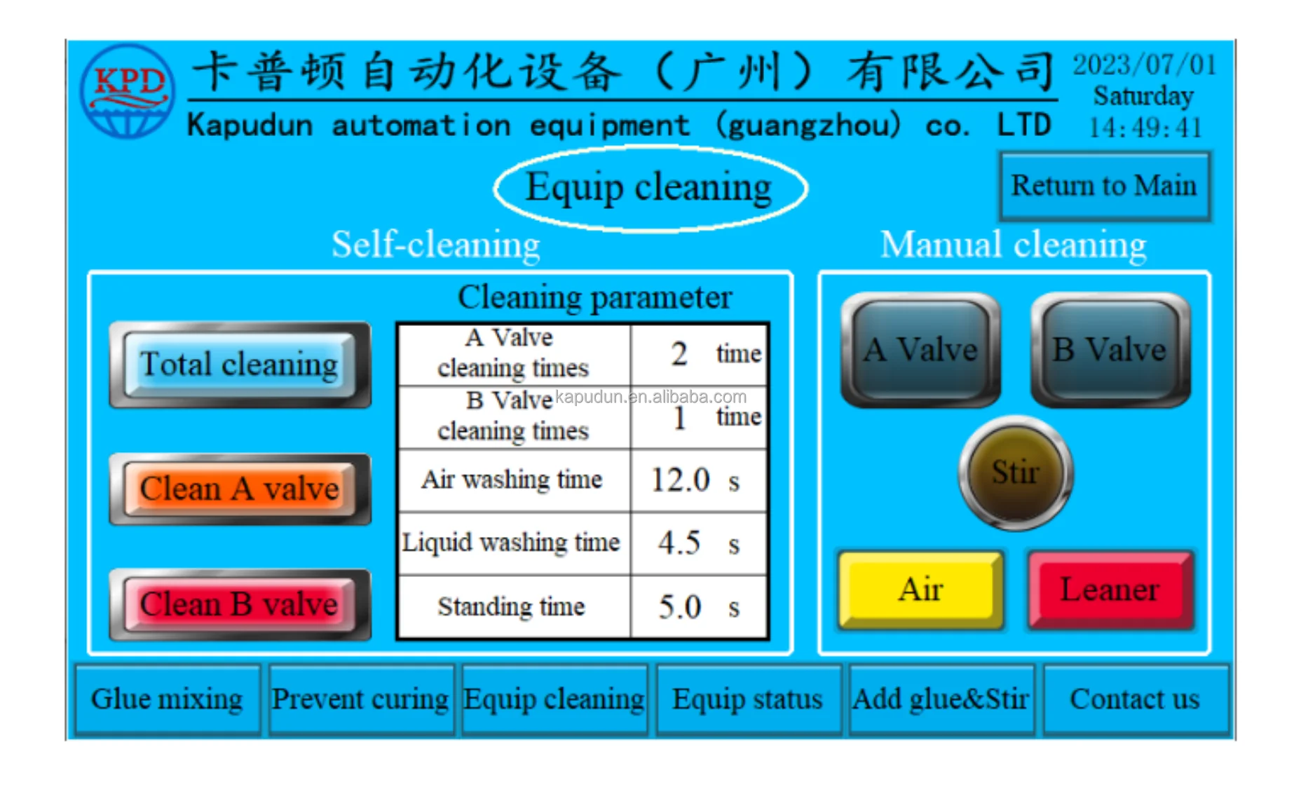 1 Dynamic mixing with stirring detecting function that ensure glue mixing evenly . 2 Stainless design of the glue touch surface to capture more higher material compatibility . 3 Glue valve with flow-back prevent function that can prevent glue from dropping when stop gluing . 4 Sealing parts of rod shaft adopt imported parts to keep more higher durability . 5 The self-cleaning function make machine cleaning more easier that you needn’t dis-assembly the parts to wash . Cleaning time and cleaning times could be set in the touch screen.