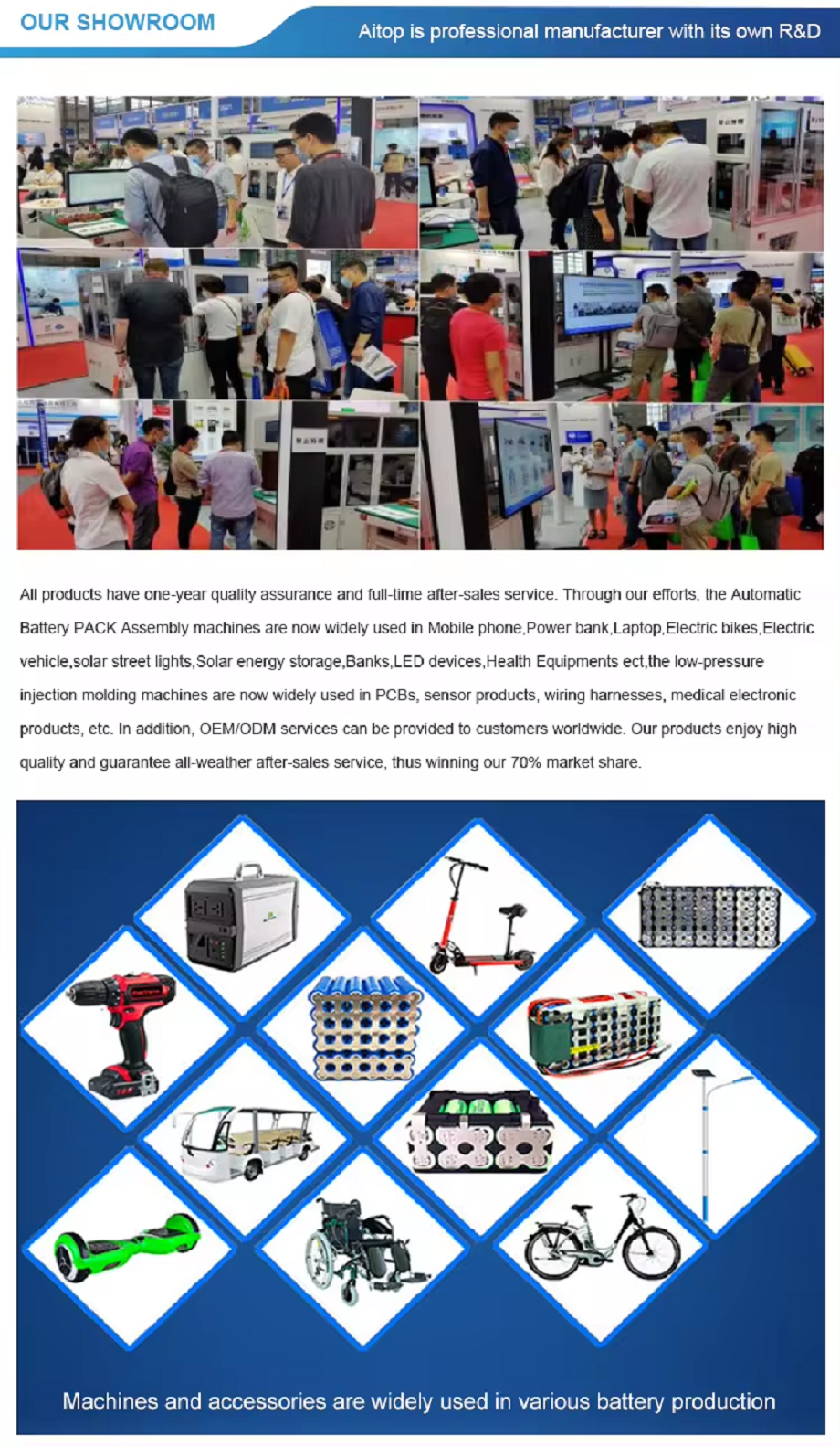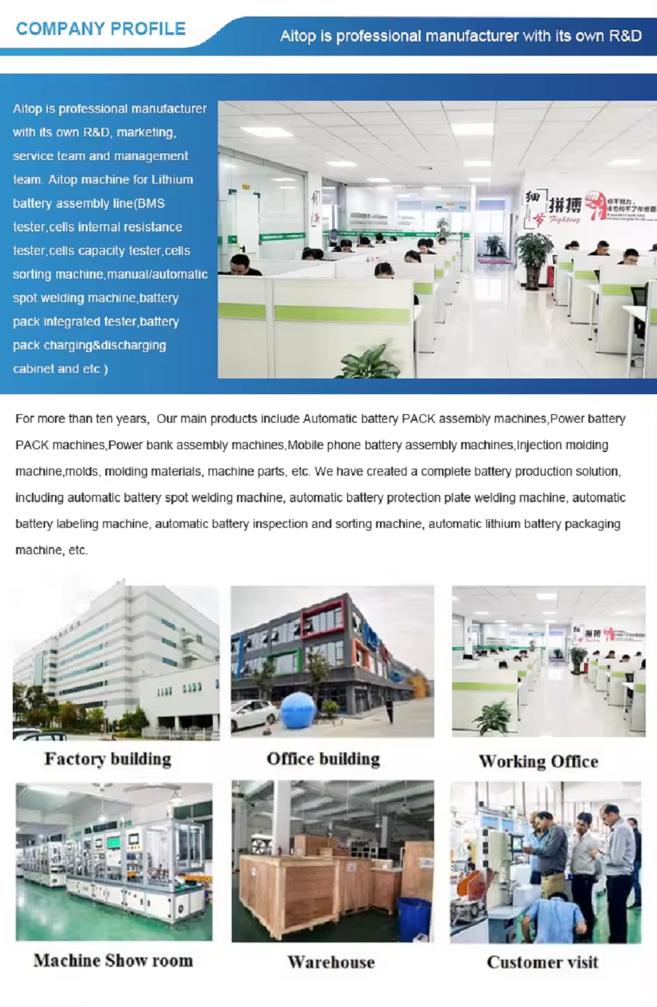About Us:Shenzhen AITOP Intelligent Equipment Co., Ltd. is a leading manufacturer and supplier of advanced lithium battery pack assembly machines and solutions. With a strong commitment to innovation, quality, and customer satisfaction, we have established ourselves as a reliable partner for businesses looking to enhance their battery manufacturing capabilities.