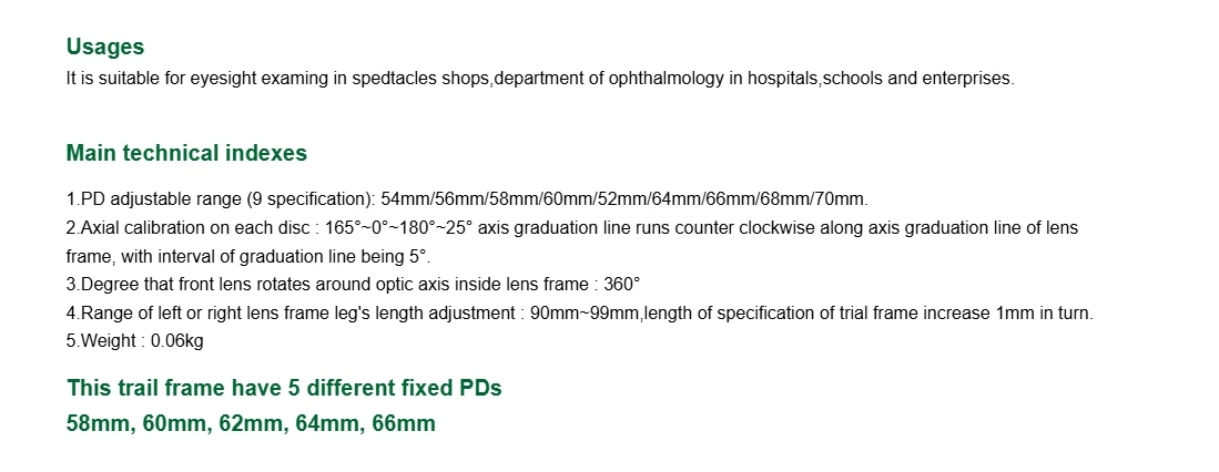 Package Includes: 1xTrial Frame 1.Pupil distance range:50; 52; 54; 56; 58; 60; 62; 64; 66; 68; 70mm. Please note the color when placing the order. 2.Axis scale:360° on the left; 360° on the right.The axis scale increases anticlockwise along the axis of the frame, and the marking interval is 5°. 3.Effective internal aperture of frame:Φ38mm. 4.The number of lenses that can be inserted into the left and right frames:3. 5.Rotation degree of optical axis of lens in inner ring of frame:360 °. 6.The nonparallelism between the optical axis of the lens and the geometric axis of the frame: ≤2.5 7.The difference between the optical center and the geometric center of the lens:≤0.5mm. 8.Displacement of the lens relative to the geometric center of the frame:≤0.3mm. 9.Adjustable length range of the left and right frame leg:125~155mm.