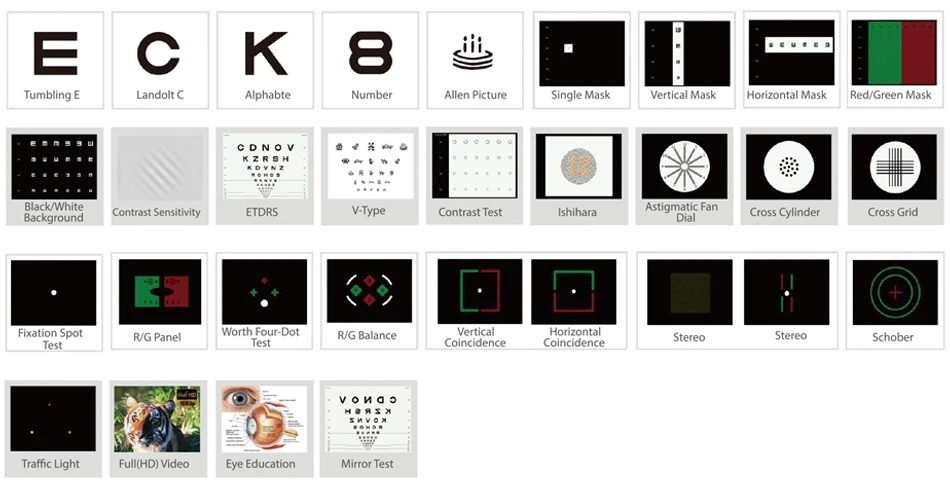 Reversible optotypes and charts for mirrored room.
