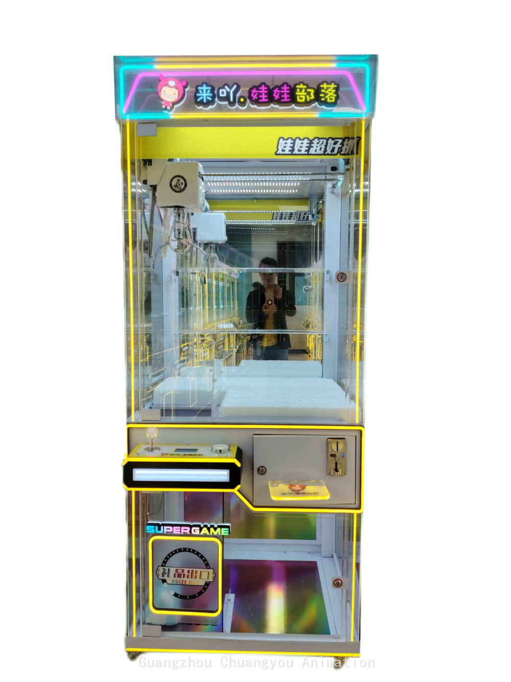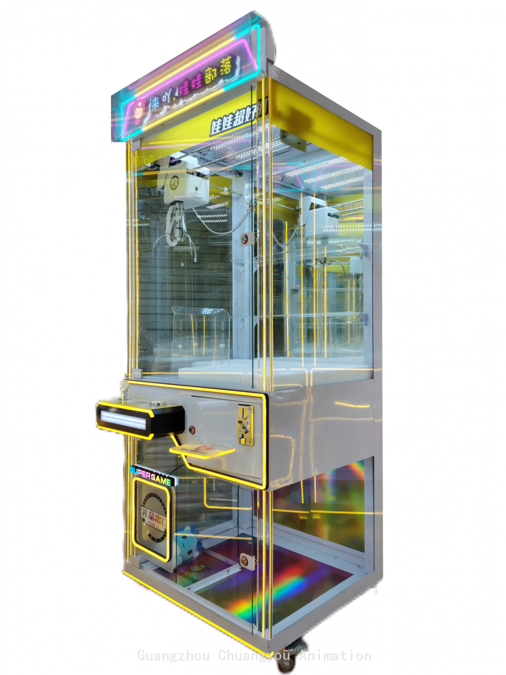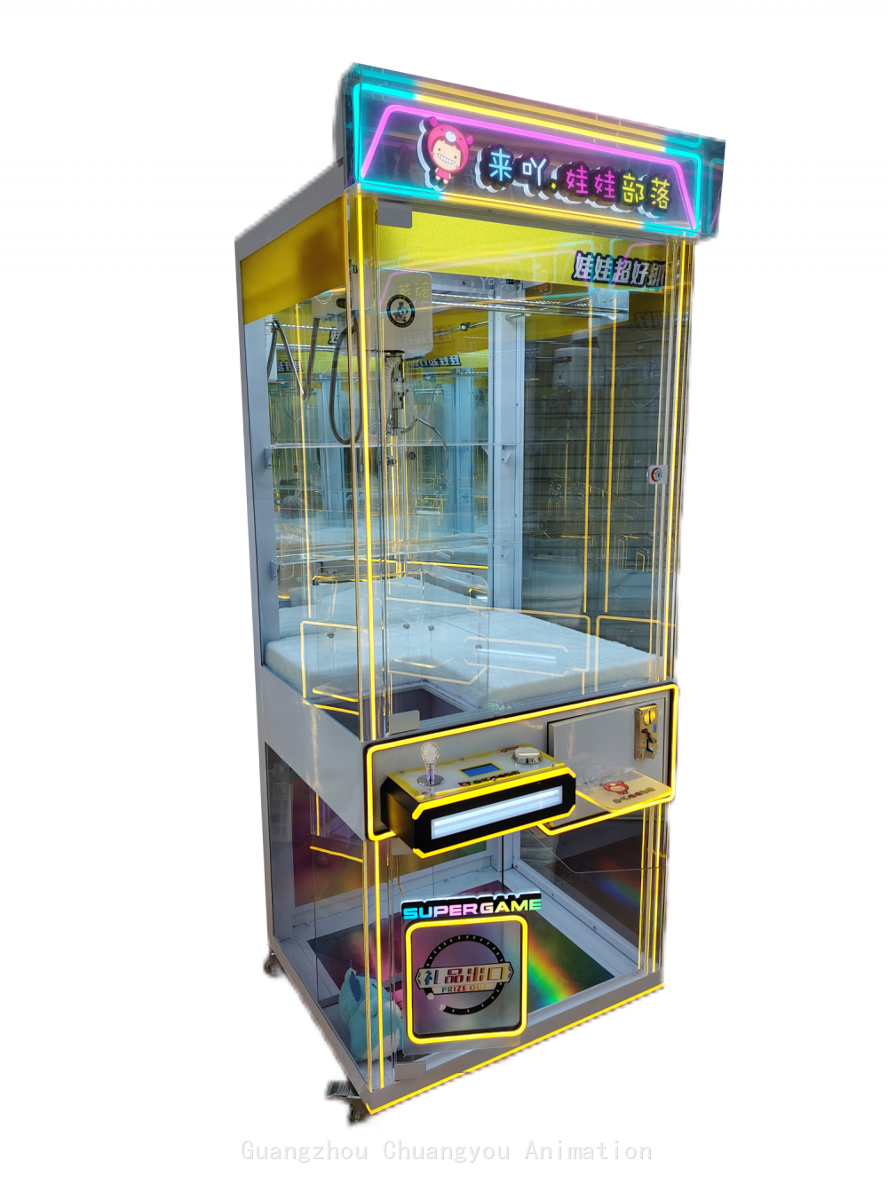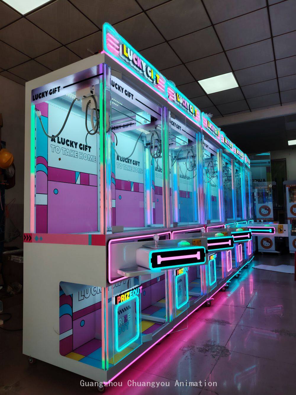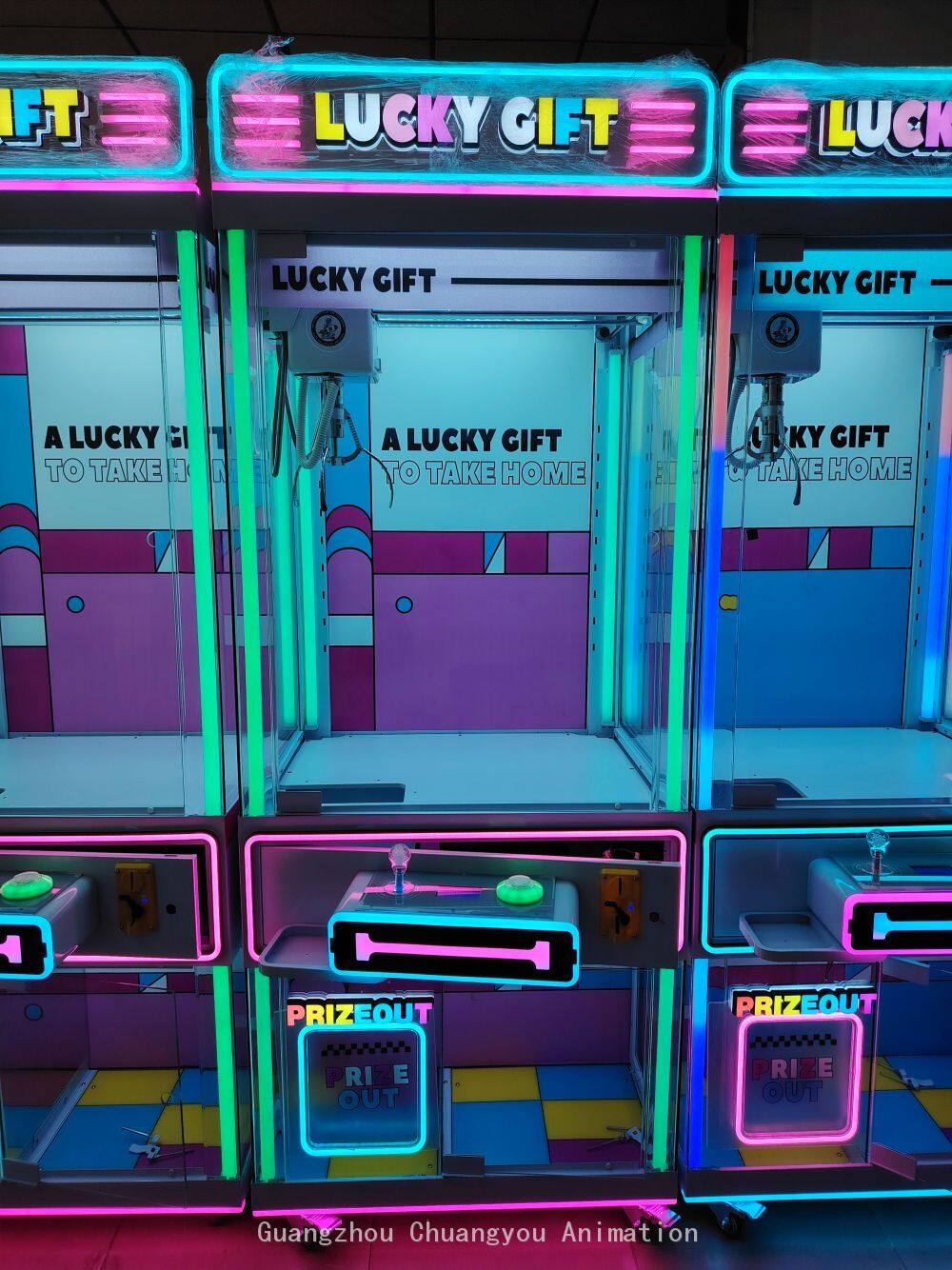 Chassis Structure: It is composed of sheet metal and tempered glass. The sheet metal material is sturdy and durable, providing stable and reliable support for the claw machine and effectively protecting the internal components. The tempered glass not only has high transparency, allowing players to clearly see the exquisite gifts inside the claw machine, but also has high strength and good impact resistance, ensuring safety during use. Motherboard Configuration: Equipped with the latest Aiwailong 12th generation liquid crystal Internet motherboard and with a liquid crystal display. This motherboard has excellent performance, enabling fast data processing and stable system operation. The liquid crystal display function can intuitively display game information, setting options, and the status of the machine, bringing great convenience to both players and operators. Through Internet connection, remote management and monitoring can also be achieved, allowing operators to keep track of the operation status of the machine at any time and conduct remote settings and updates. Crane Design: The crane adopts high-end desktop injection-molded rolling gears, which have the characteristics of anti-slip and wear resistance. This design makes the crane run more smoothly during operation and enables precise control of the claw to reach the designated position to grab gifts. The anti-slip and wear-resistant rolling gears effectively extend the service life of the crane, reduce the frequency of failures caused by wear and tear, and lower the maintenance cost. Power Supply Specifications: The power supply uses a high-power dedicated power supply for claw machines, supporting a voltage range of 110 - 220V. This means that the claw machine can adapt to different regional voltage standards and can operate normally in most places both at home and abroad. The high-power power supply can provide sufficient and stable power supply for all components of the machine, ensuring that the claw machine always maintains good performance during long-term operation. Game Functions Intelligent Claw Force Adjustment and Recognition: It can intelligently adjust the claw force according to the weight and material of different gifts. For light gifts, a smaller claw force is used to avoid damaging the gifts due to excessive claw force; for heavy gifts, the claw force is automatically increased to ensure successful grabbing, greatly improving the success rate and gaming experience of players in grabbing gifts. Winning and Online Flashing: When a player wins a prize successfully, not only will the lights of the claw machine flash, but it can also flash together with other connected claw machines, creating a warm winning atmosphere, attracting the attention of more players, and increasing the liveliness and attractiveness of the venue. Claw Swinging Allowed / Claw Swinging Prevented: According to the needs of the operator, it can be set whether to allow players to swing the claw. The claw swinging function provides players with more operation skills and fun, increasing the challenge of the game; the claw swinging prevention setting can maintain the fairness of the game and avoid damage to the machine caused by players swinging the claw excessively. Gift Statistics: It automatically counts the number of gifts in the machine and the situation of gifts being grabbed, facilitating operators to promptly understand the gift inventory, reasonably arrange replenishment plans, and ensure that there are always enough gifts in the machine for players to grab. Gifts Falling Near the Hole: When a gift is grabbed by the claw and is close to the hole, if certain conditions are met, the gift can automatically fall, increasing the chances for players to obtain gifts and enhancing players' satisfaction and participation in the game. Customization Service: The lights and the logo on the top are customizable. Operators can customize unique lighting effects and personalized logos on the top according to the decoration style of their venues, brand characteristics, or event themes, enabling the claw machine to better integrate into the business environment, playing a role in promotion and enhancing the brand image and recognition.