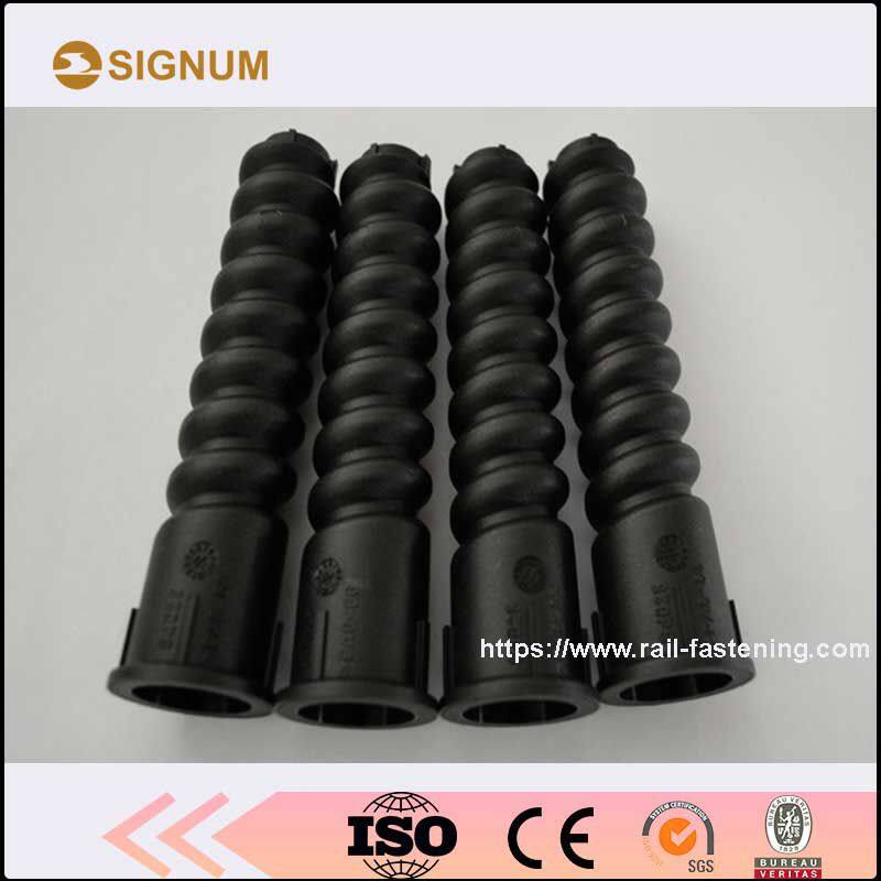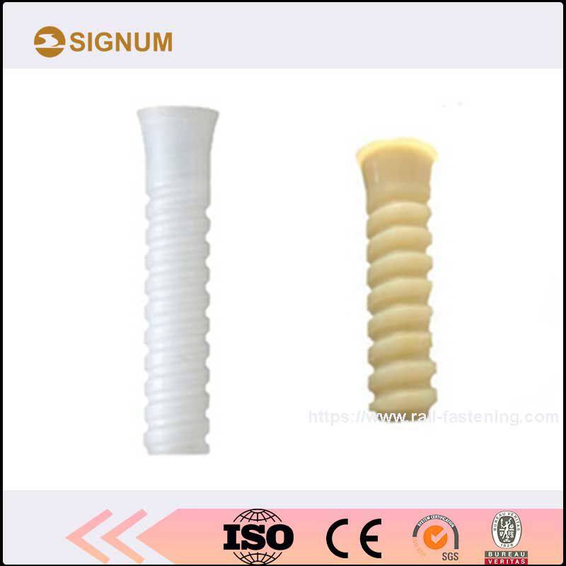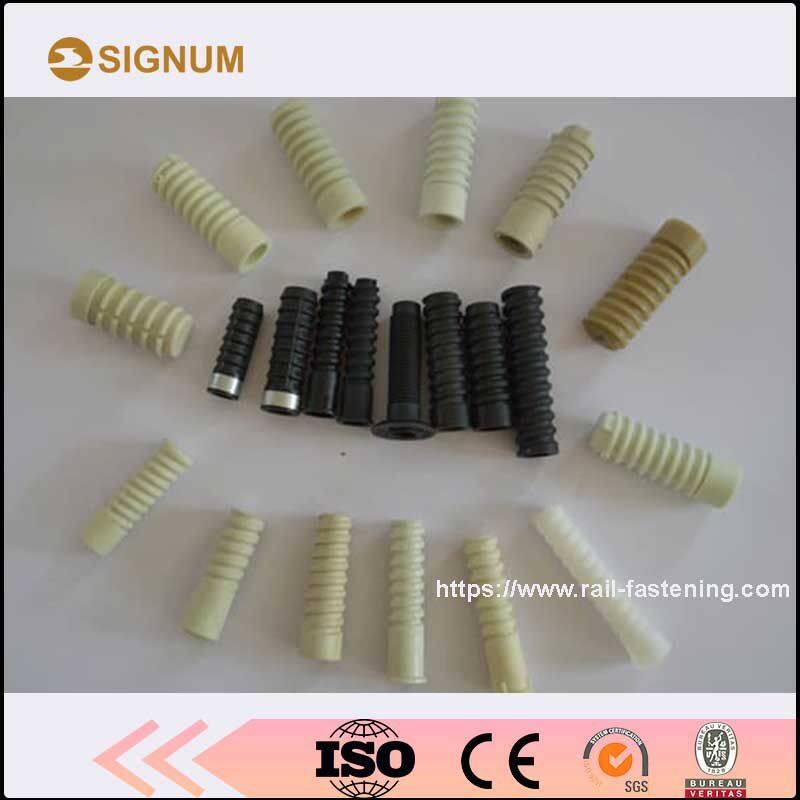 Rail plastic dowels are part of the rail fastening system. They are usually pre-inserted individually into concrete sleepers before assembling the rail fastening system components. Rail plastic dowels are also knew as concrete dowels, concrete inserts, rail plastic sleeves, plastic inserts, etc. The function of rail plastic dowels are to insulate the fastener parts from the ties.