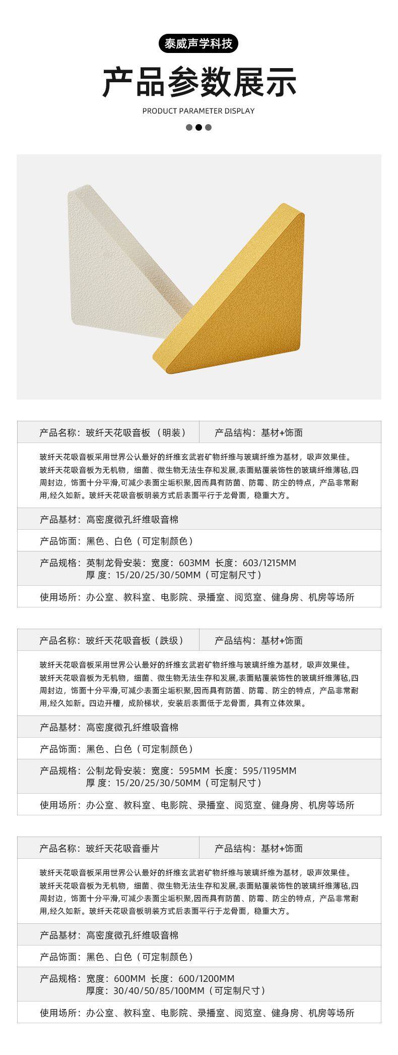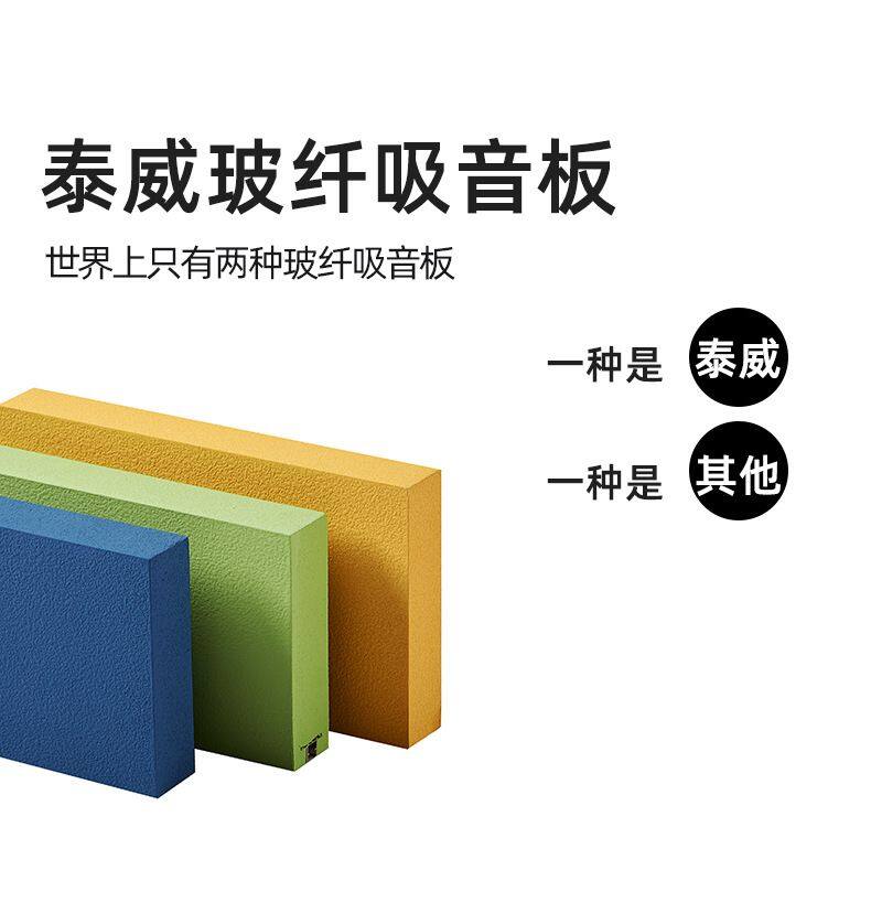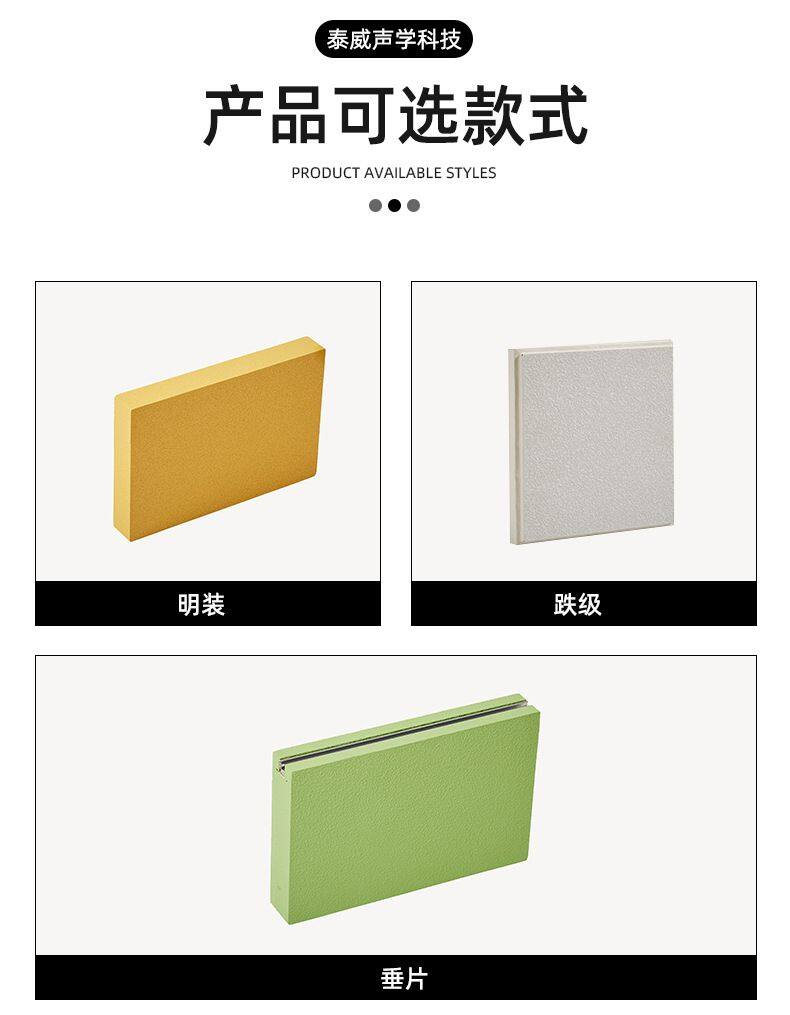 Fiberglass sound absorption board is also often called fiberglass ceiling, which is often used for ceiling suspension. There are several different installation methods, and the coating color can be customized in any single color. It is easy to install, has good sound absorption effect, and the regular thickness can be customized, with a maximum size of 1200*2400mm.