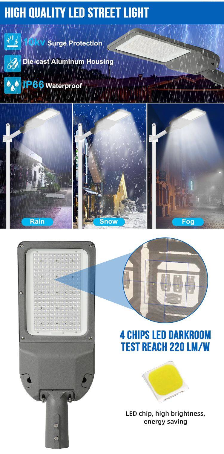 Durable and Waterproof Design: This street light features a die-casting aluminum material with an IP66 rating, ensuring it can withstand harsh outdoor conditions and heavy usage.