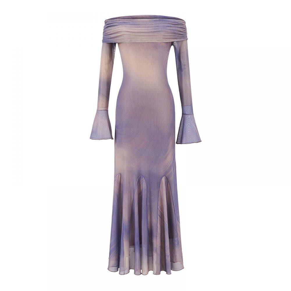 Early Spring New Design: European-American Contrasting Color Print Frill-Edge One-Sided Shoulder Flared Long-Sleeved Fish-Tail Dress