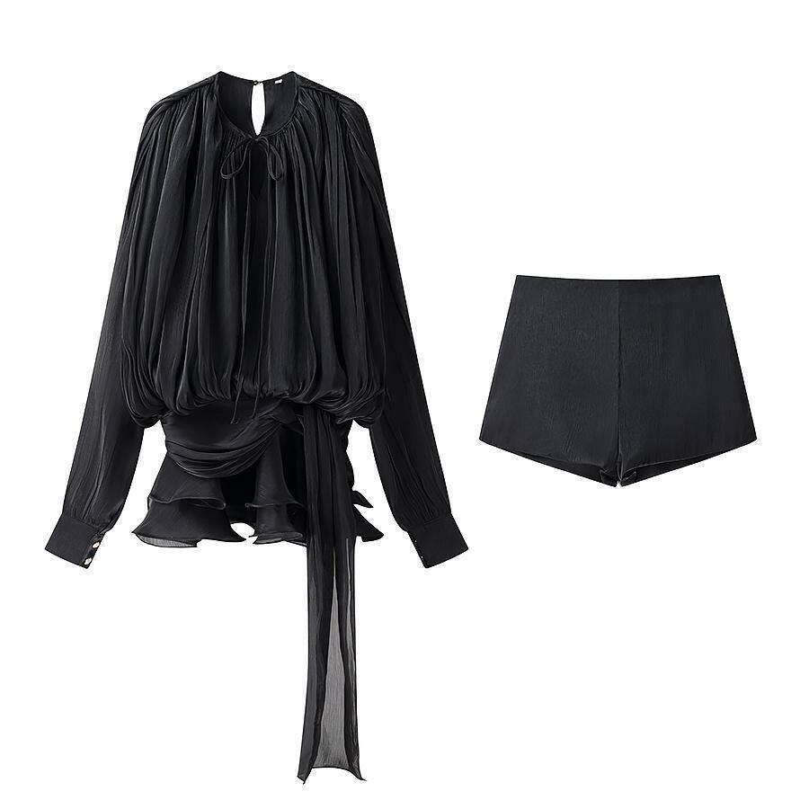 Chic lantern-sheer fabric dress for women, new spring style, short skirt, cinched waist, irregular lotus leaf hem, with tie.