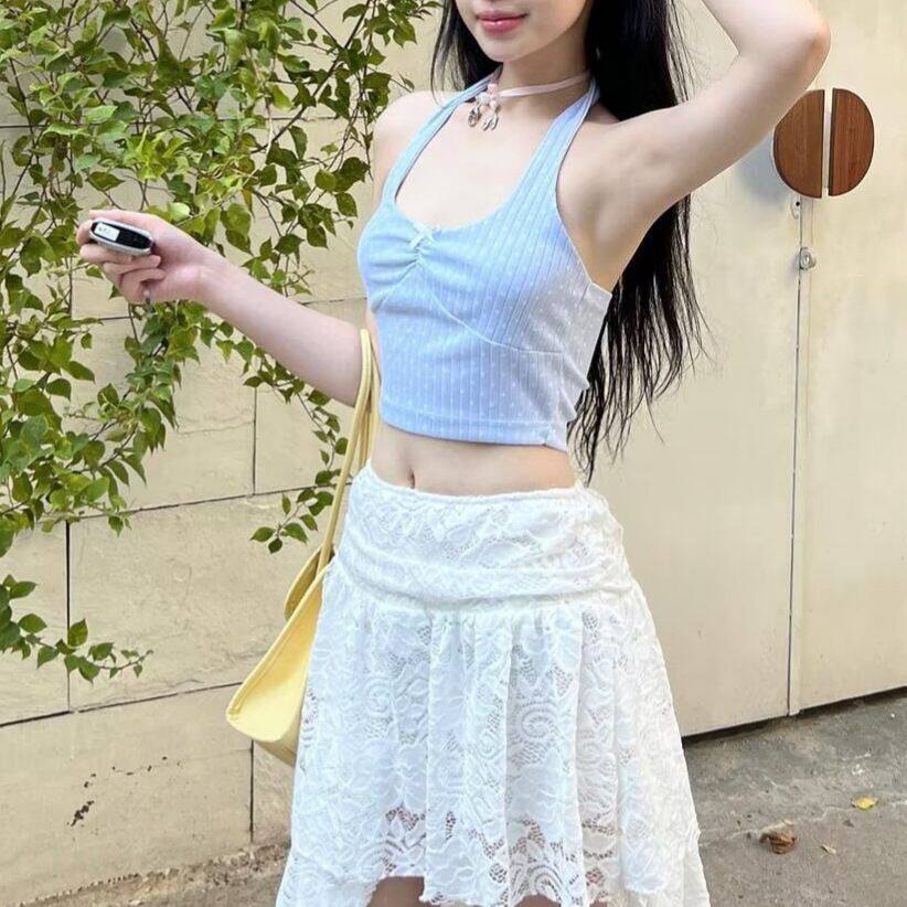 Purely erotic, spicy girl style, sexy V-neck short-sleeved tank top with a backless design, cute and fresh, small and pretty, featuring dotted prints on the front.