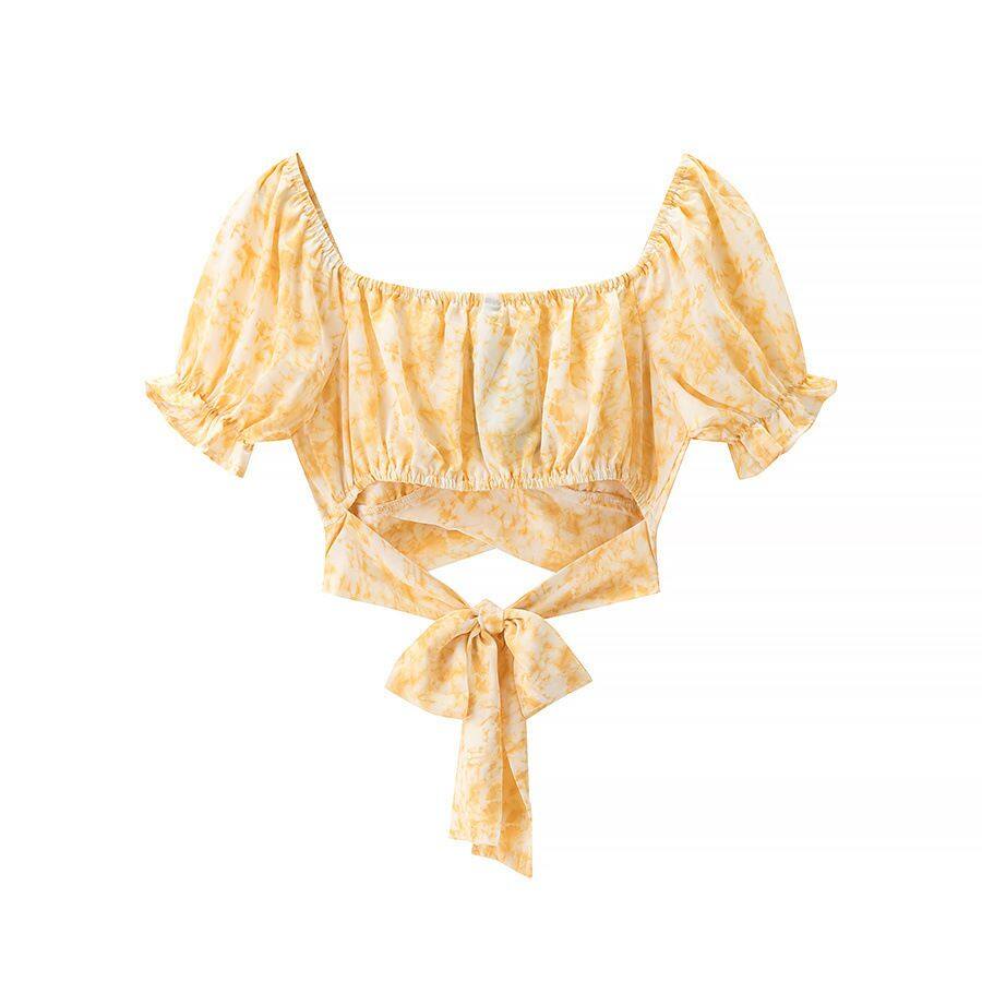 European/American style women's clothing, new style, fashionable and versatile. Tie design, short-sleeved, plunging neckline, printed top.