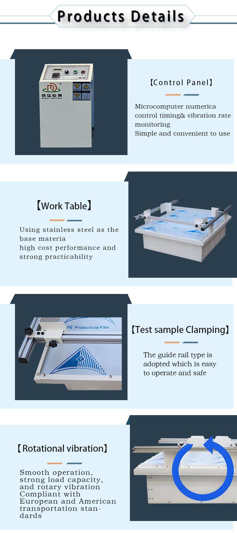Application Scenario: For precision instruments, electronic products, industrial equipment, etc., which are transported by rail, their stability and safety during rail transportation can be evaluated.