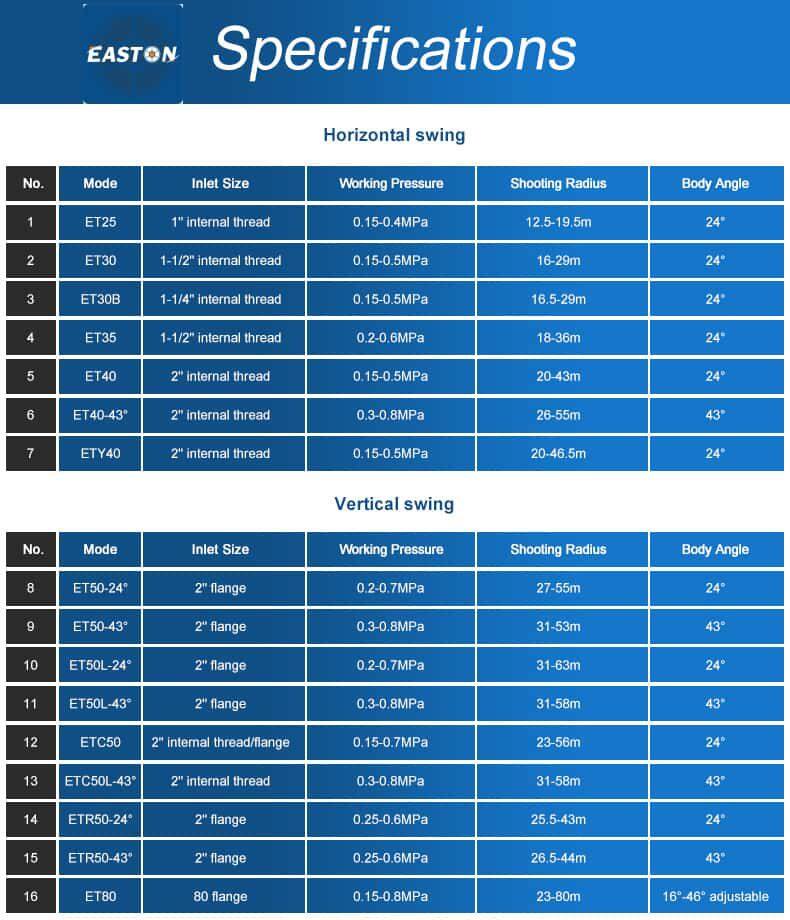 ETC50 vertical impact sprinkler manufactured with durable, high strength alloy and copper casting materials, possessing excellent structural strength and corrosion resistance. It is a remarkable sprinkler in fields such as agricultural irrigation and industrial dust suppression, winning the favor of users with its excellent design and superior performance.