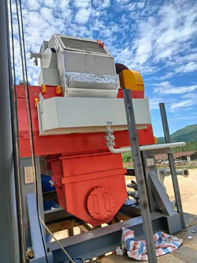 The slurry enters the feeding hopper through the feeding pipe, and flows through the gap of the upper magnetic field through the rotating ring. The induction magnetic medium composed of high conductivity stainless steel rods inside the rotating ring is magnetized in the background magnetic field, forming a high gradient magnetic field on the surface of the magnetic medium. The magnetic particles in the slurry are adsorbed on the surface of the magnetic medium, and are carried to the top non magnetic field area as the rotating ring rotates. The magnetic material is flushed into the concentrate hopper through flushing with pressure flushing water, Non magnetic particles flow into the tailings hopper along the gap below the magnetic pole and are discharged. To achieve material sorting. The magnetic medium at the lower part of the rotating ring is immersed in the liquid level of the ore slurry. At the same time as the ore slurry is injected, the stroke box installed on one side of the tailings tank continuously moves back and forth, causing the ore slurry in the sorting room to fluctuate up and down through the drum film. The pulsating fluid force keeps the ore particle group in a loose state throughout the sorting process, effectively removing impurities from the particle group and significantly improving the grade of the concentrate.