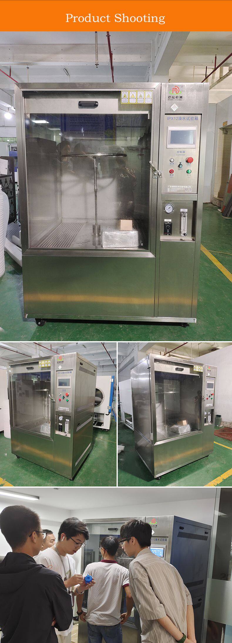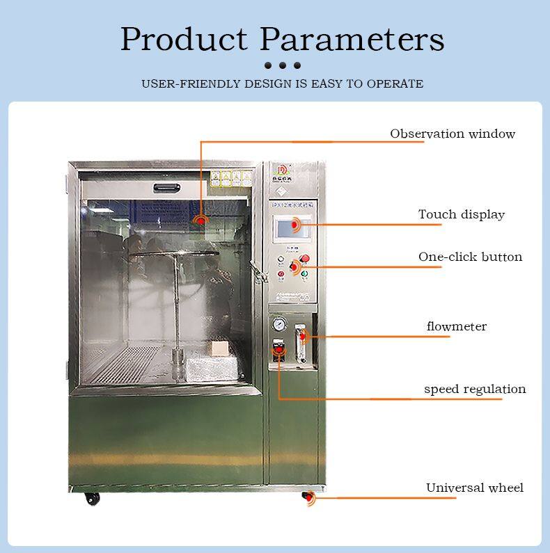 Rainfall test box Consumer electronics, home appliances, lamps, small outdoor equipment. Smart phones, smart watches, outdoor lamps, security cameras (to verify the sealing under daily rain or splash environment).