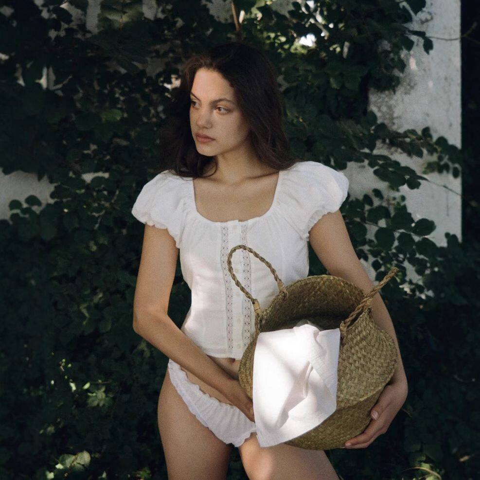 2025 Summer New French Pure Style Bow Decoration Love Hollow One-line Collar T-shirt Top