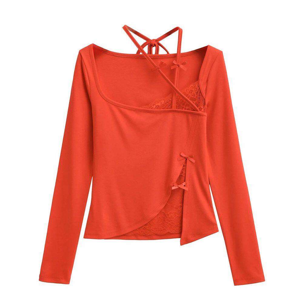 Ins Pure Desire Style Lace Stitching Bow T-shirt Women's Spring and Summer New Irregular Design Long-sleeved Hot Girl Top