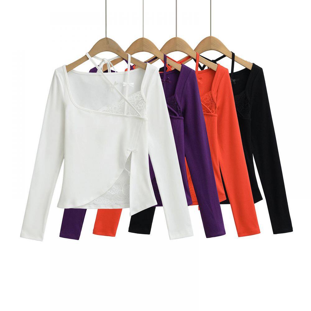 Home > Products > T-shirt > Ins Pure Desire Style Lace Stitching Bow T-shirt Women's Spring and Summer New Irregular Design Long-sleeved Hot Girl Top