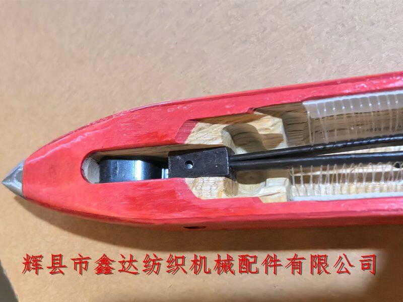 The above picture is a photo of the front part of the shuttle; There are four pink porcelain eyes on the top of the shuttle, made of aluminum oxide material, with locking screws to fix the living bell, and a detachable small shuttle tip is used for the shuttle tip. Textile wooden equipment 365 * 35 * 25mm silk woven wooden shuttle (with movable bell) is divided into left and right hands, as shown in the following picture.