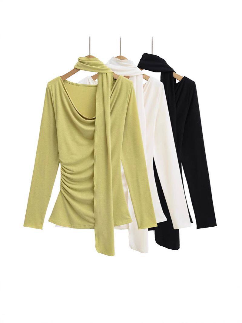 Pure desire style loose collar hanging neck streamer long-sleeved T-shirt spring design pleated slim body hot girl bottom shirt women