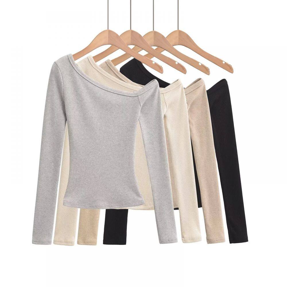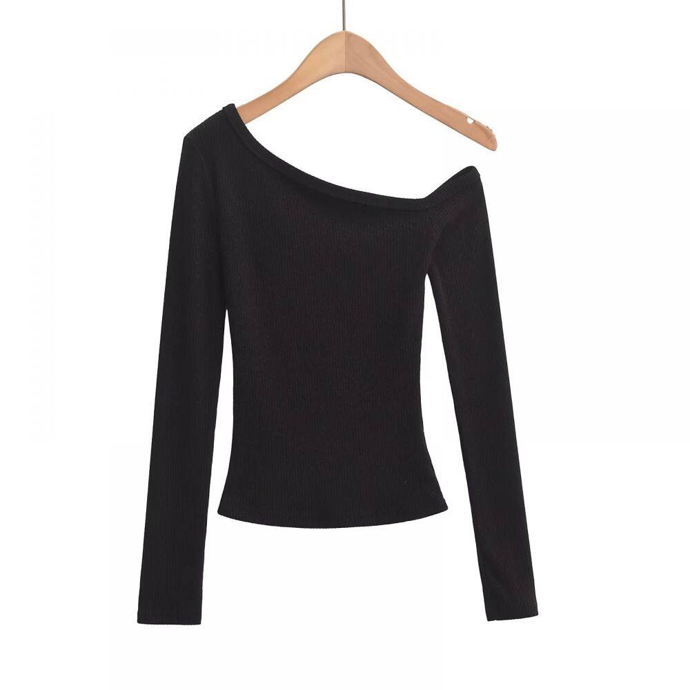 European and American Style New Hot Girl Off-the-shoulder Shiny Slanted Collar Long-sleeved T-shirt Irregular Fitting Top Women