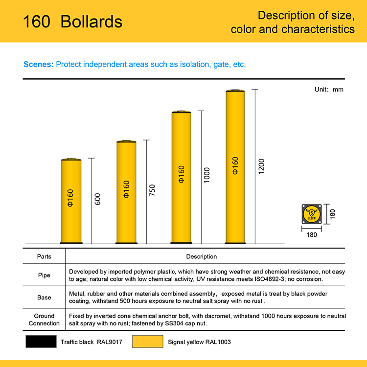 | Ground Connection | Fixed by inverted cone chemical anchor bolt, with dacromet, withstand 1000 hours exposure to neutral salt spray with no rust; fastened by SS304 cap nut. |