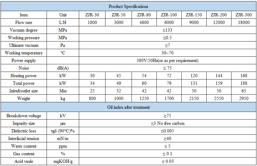 1. Recovery of PH value & color 2. Remove water, particles quickly 3.Improve the breakdown voltage 3. Specializing in deeply deteriorated 4. Able to serve as vacuum filling and drying of transformer