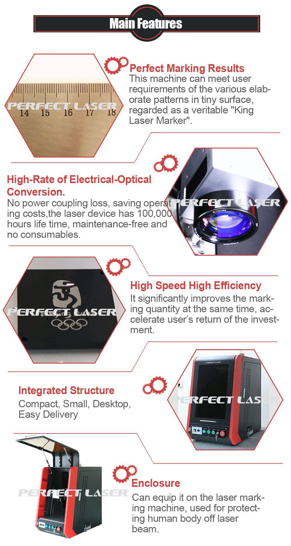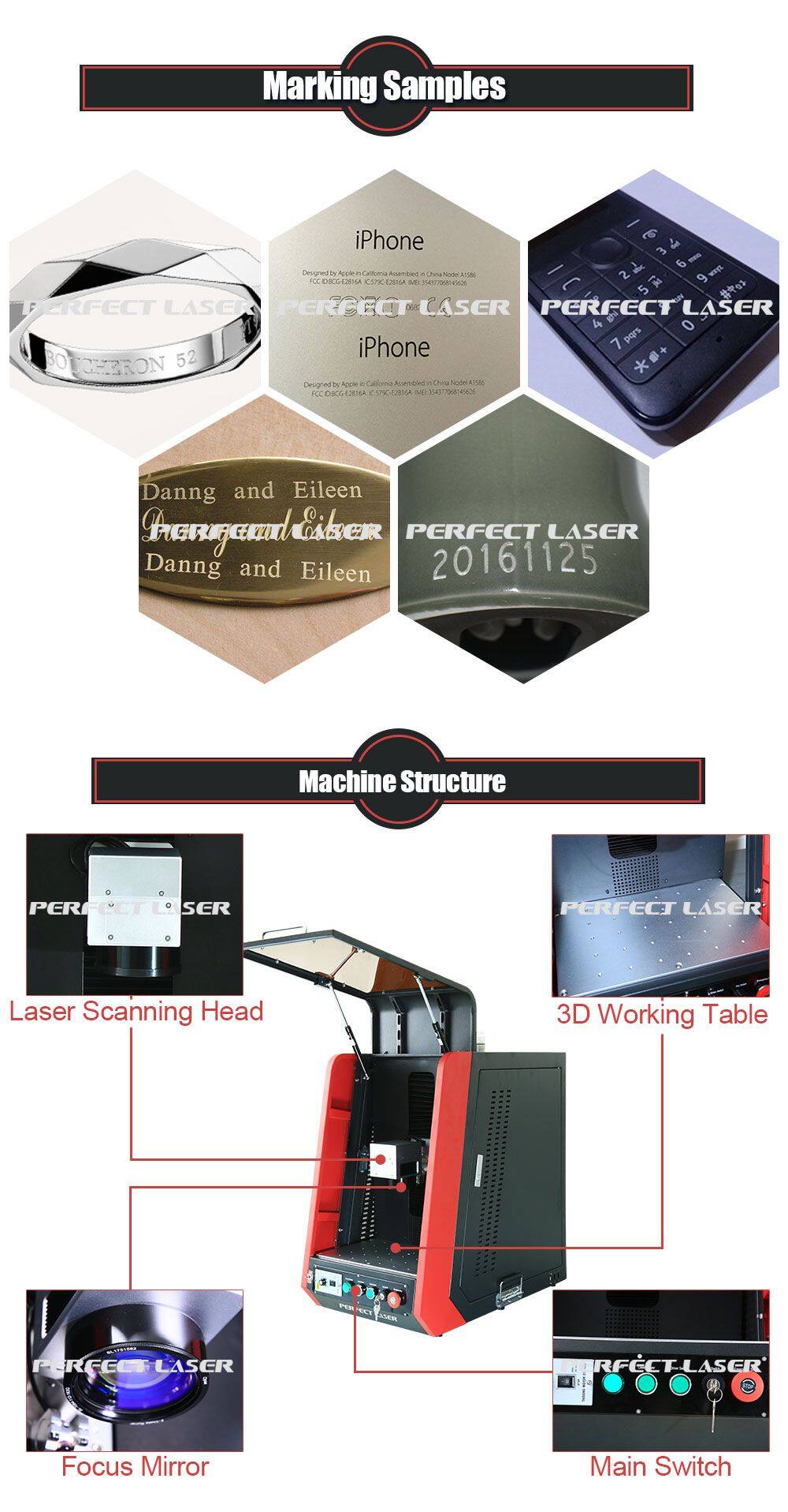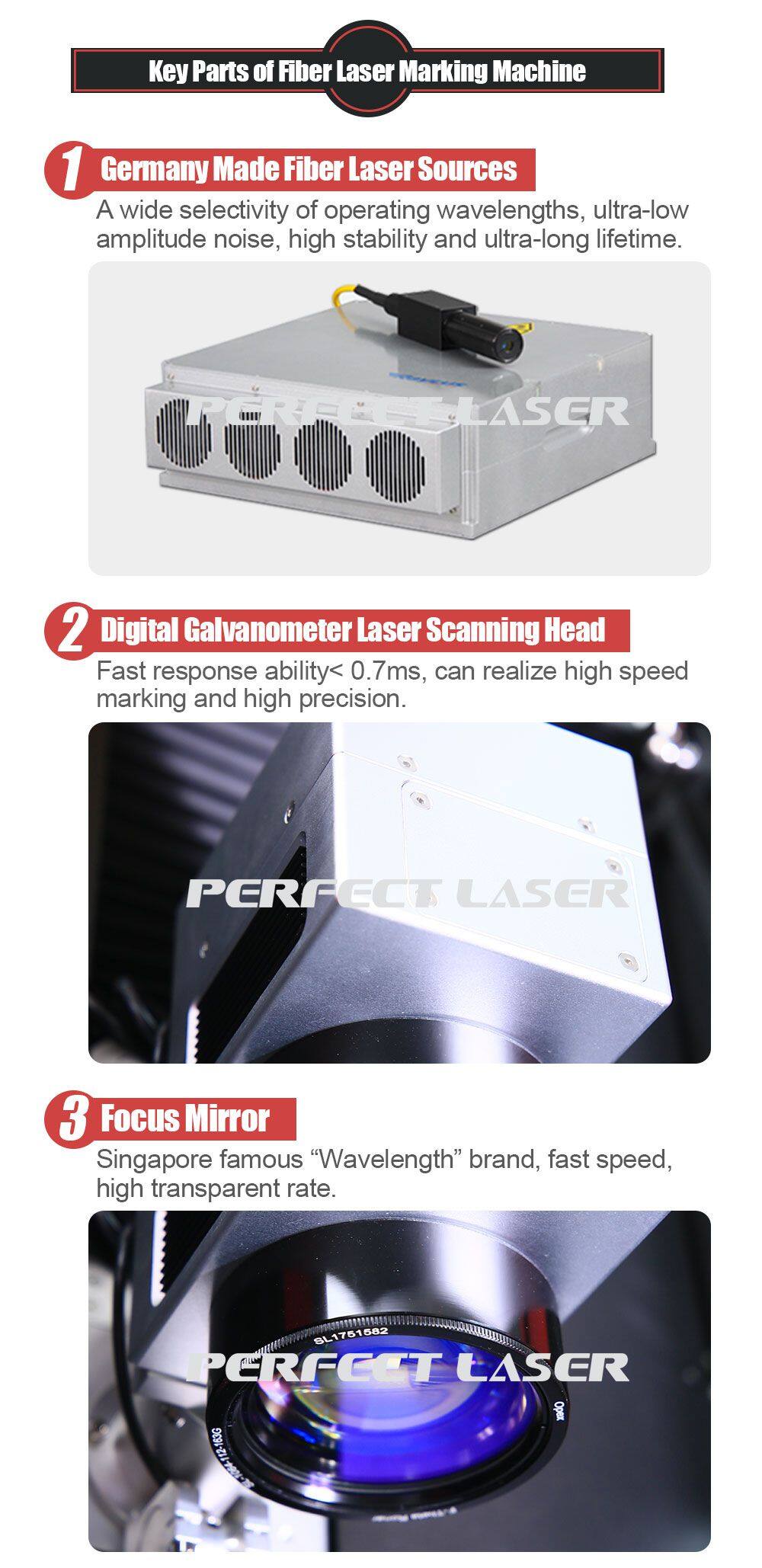 Perfect Laser's Fiber Laser Marking Machine adopts international most advanced technology and the laser source is fiber with Germany IPG technology, lifetime can reach 100, 000 hours, 8-10 years without any consumables and maintenance. The diode coupling with fiber to process pump, the pump light will course the particles reverse which can emit high quality laser beam. This is the best choice for the customers who have special requirements to the smallest & finest laser beam and character.