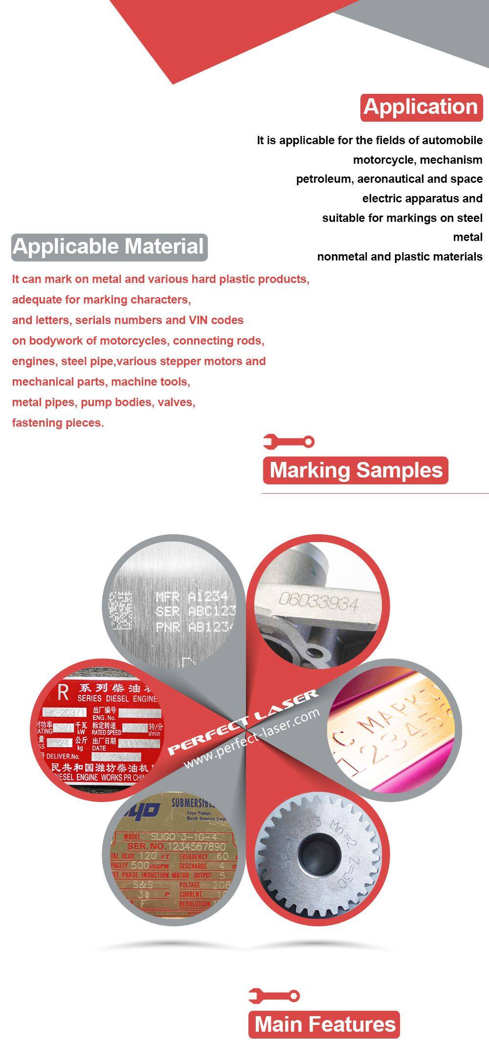 Application scope: It is applicable for the fields of automobile, motorcycle, mechanism, petroleum, aeronautical and space, electric apparatus and suitable for markings on steel, metal, nonmetal and hard plastic materials.