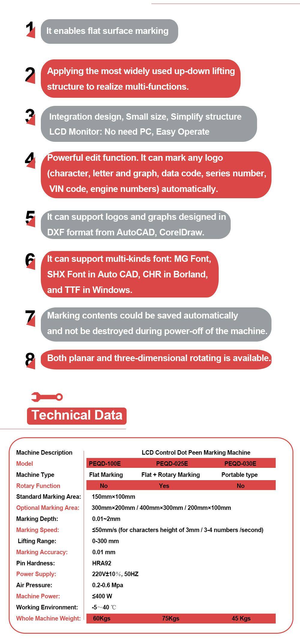 PEQD series DOT Peen Marking Machine is adequate for flat surface marking on various kinds of metal / non-metal labels & accessories.