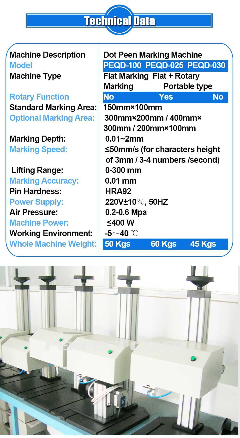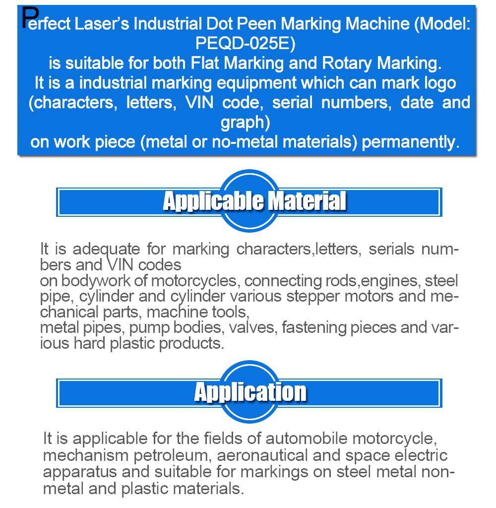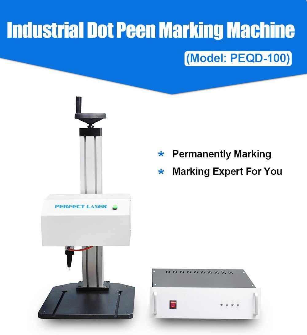 Perfect Laser is a famous dot peen marking machine manufacturer. Our PEQD-100 dot peen marking machine is suitable for flat marking on metals and some hard plastics . The dot peen marking machine is an industrial marking machine which can make permanently logo,letters,numbers,graph and date on workpiece with direct part marking.