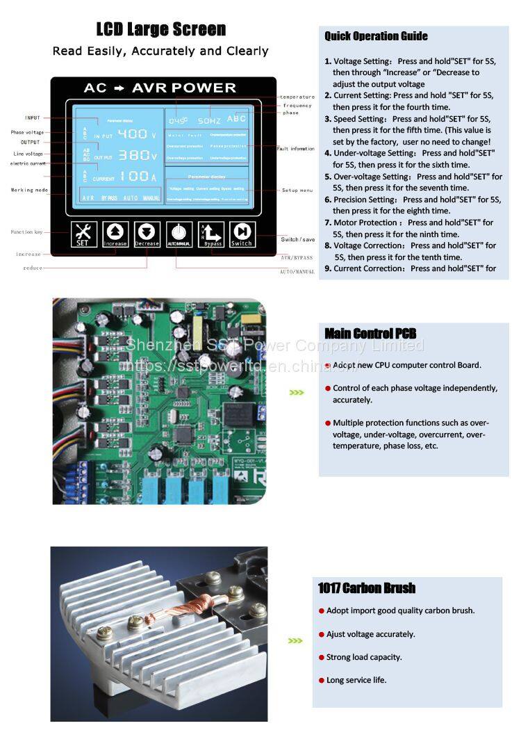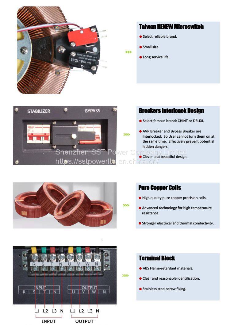 SBW three-phase 380V voltage stabilizer is suitable for a wide range of loads, can withstand instantaneous overload, and can work continuously for a long time. The mains voltage and bypass can be switched according the real situation, and it is equipped with automatic protection devices for overvoltage, overcurrent, phase sequence, and mechanical failure.