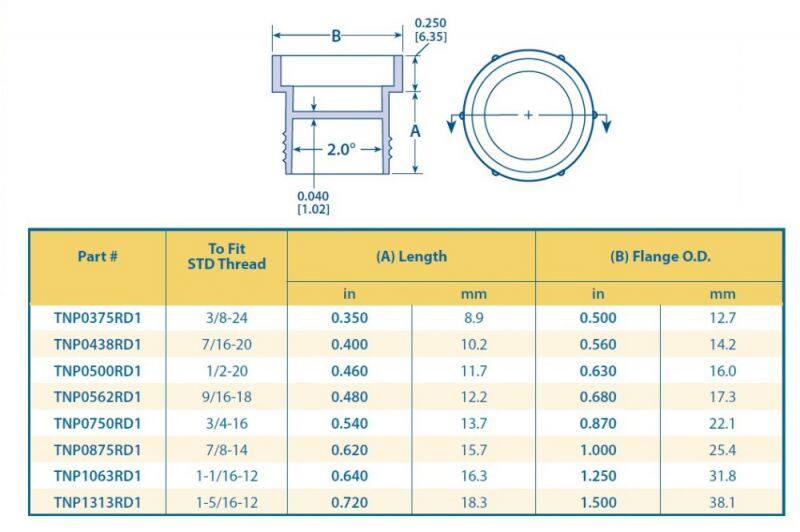 Our TNP Series Threaded Plugs are molded in Red polyethylene plastic and sized to fit Flareless Tube and Nut Assemblies from 3/8-24 thru 1-5/16-12.