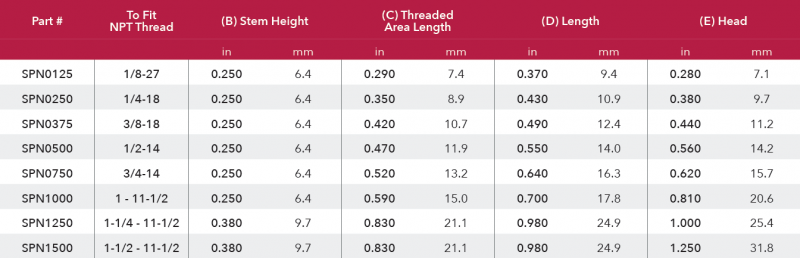 Protects threaded components from moisture, dust and damage during production, shipping and storage, and can also be used as masking during painting and plating. Our SPN Series Threaded Plugs are molded in Red polypropylene plastic and sized to fit NPT threads from 1/8-27 thru 1-1/2-11-1/2.