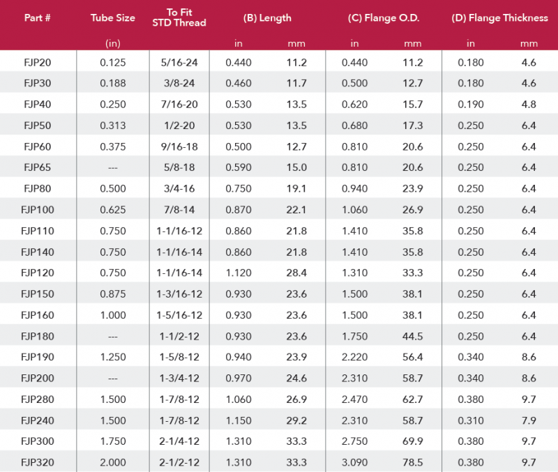 low-pressure testing requirements. Our FJP Series Threaded Plugs are molded in Red polyethylene plastic and sized to fit Flared JIC Fittings from 5/16-24 thru 2-1/2-12 for nominal sized tubes from 1/8 thru 2.