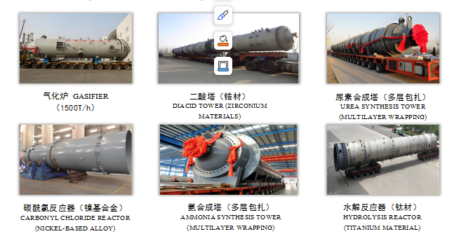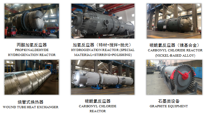 We undertakes the core equipment manufacturing business of synthetic ammonia, methanol, olefin, polyol, caprolactam, nylon 6, organic silicon, formic acid, hydrogen peroxide, polycarbonate, bisphenol A, fertilizer, caustic soda and other projects, including gasification furnace, synthesis tower, reactor, conversion furnace, low-temperature tower, desulfurization tower, separator, large storage tank, oxidizer and other equipment.