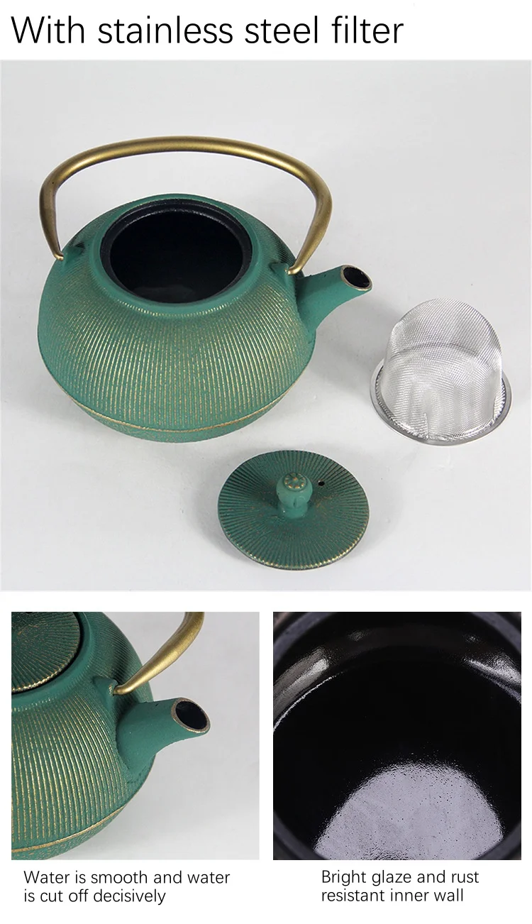 4. Cast iron Teapot is not easy to rust, black enamel coats interior to prevent rust ,Includes a stainless Steel Filter.